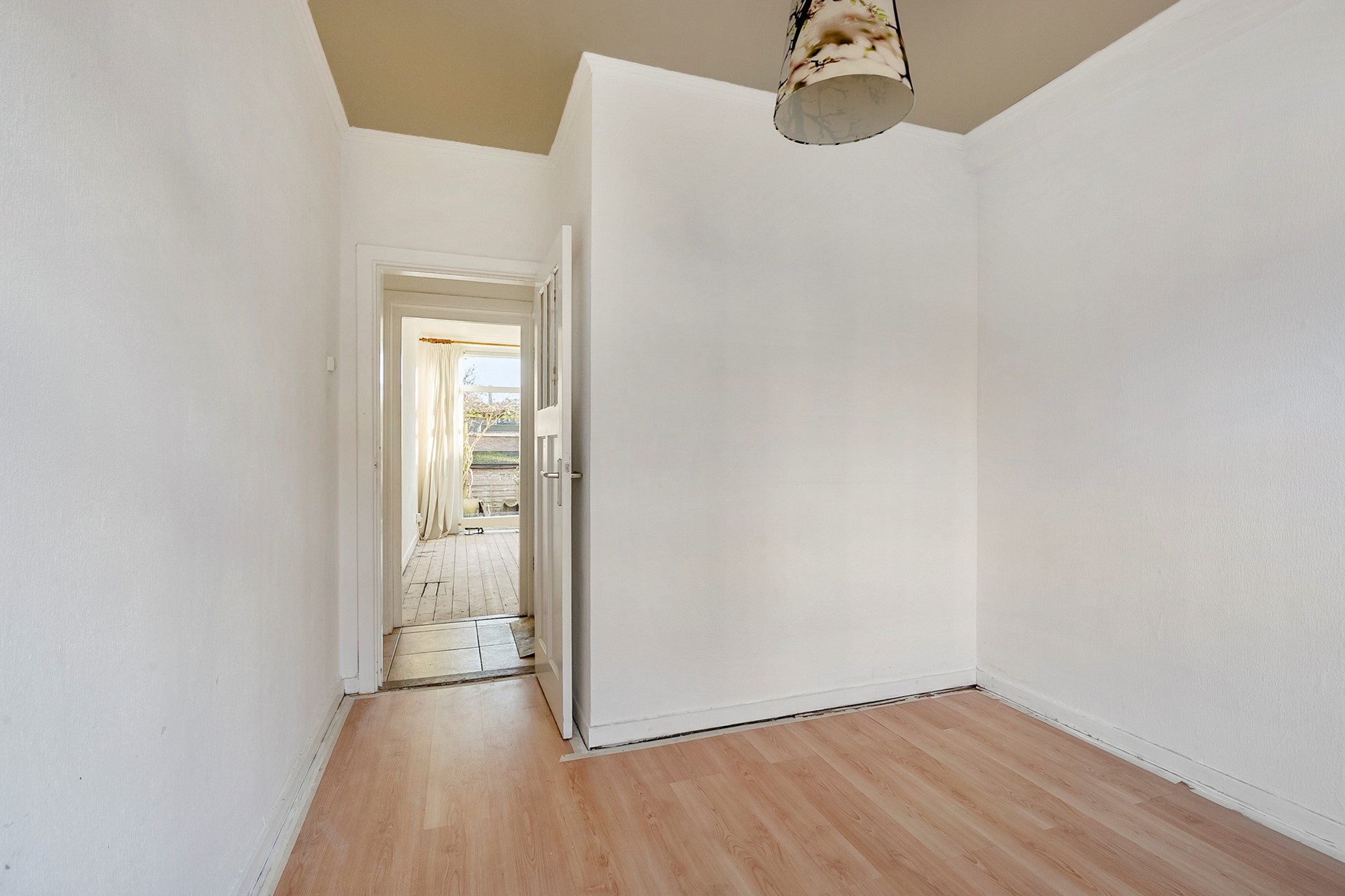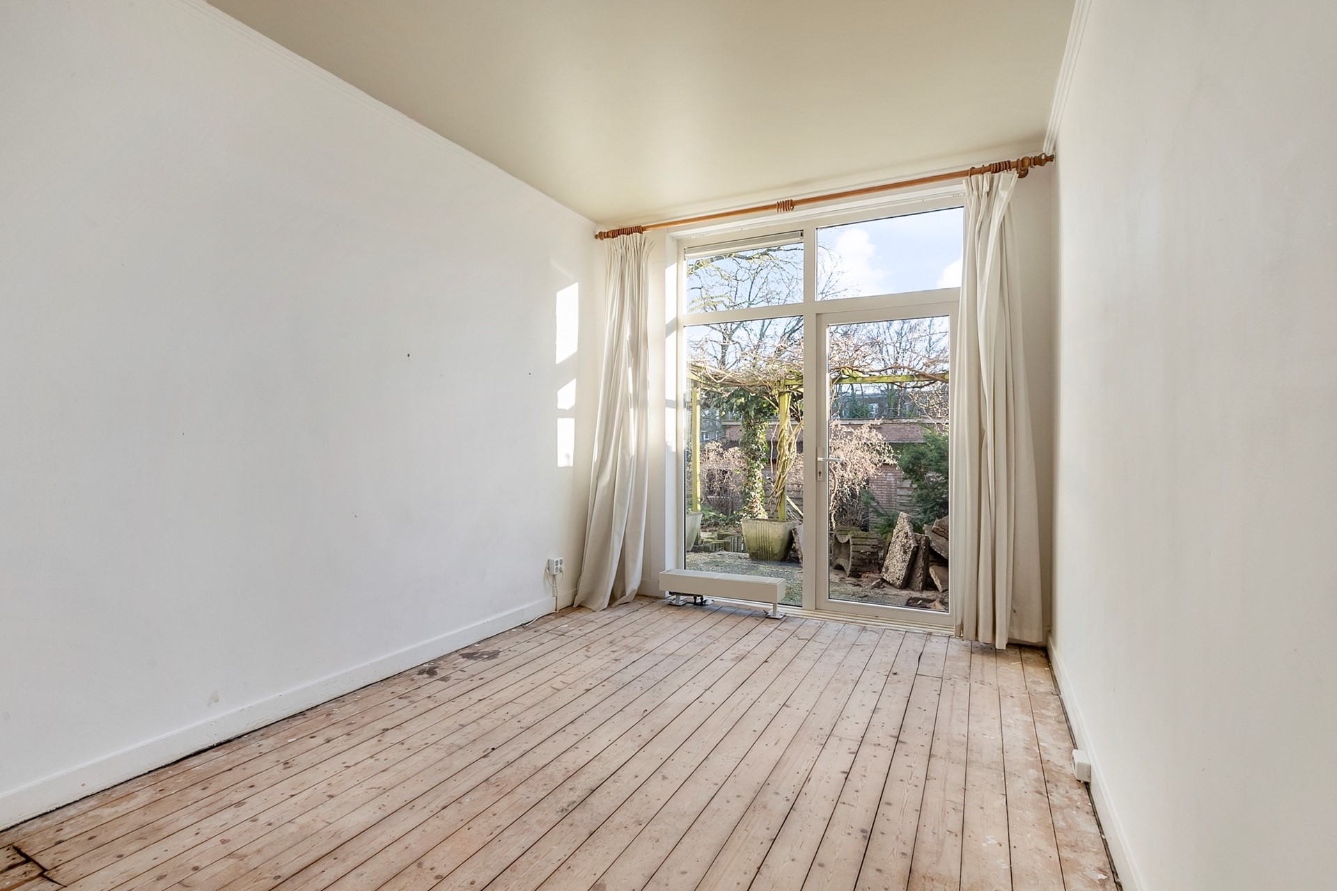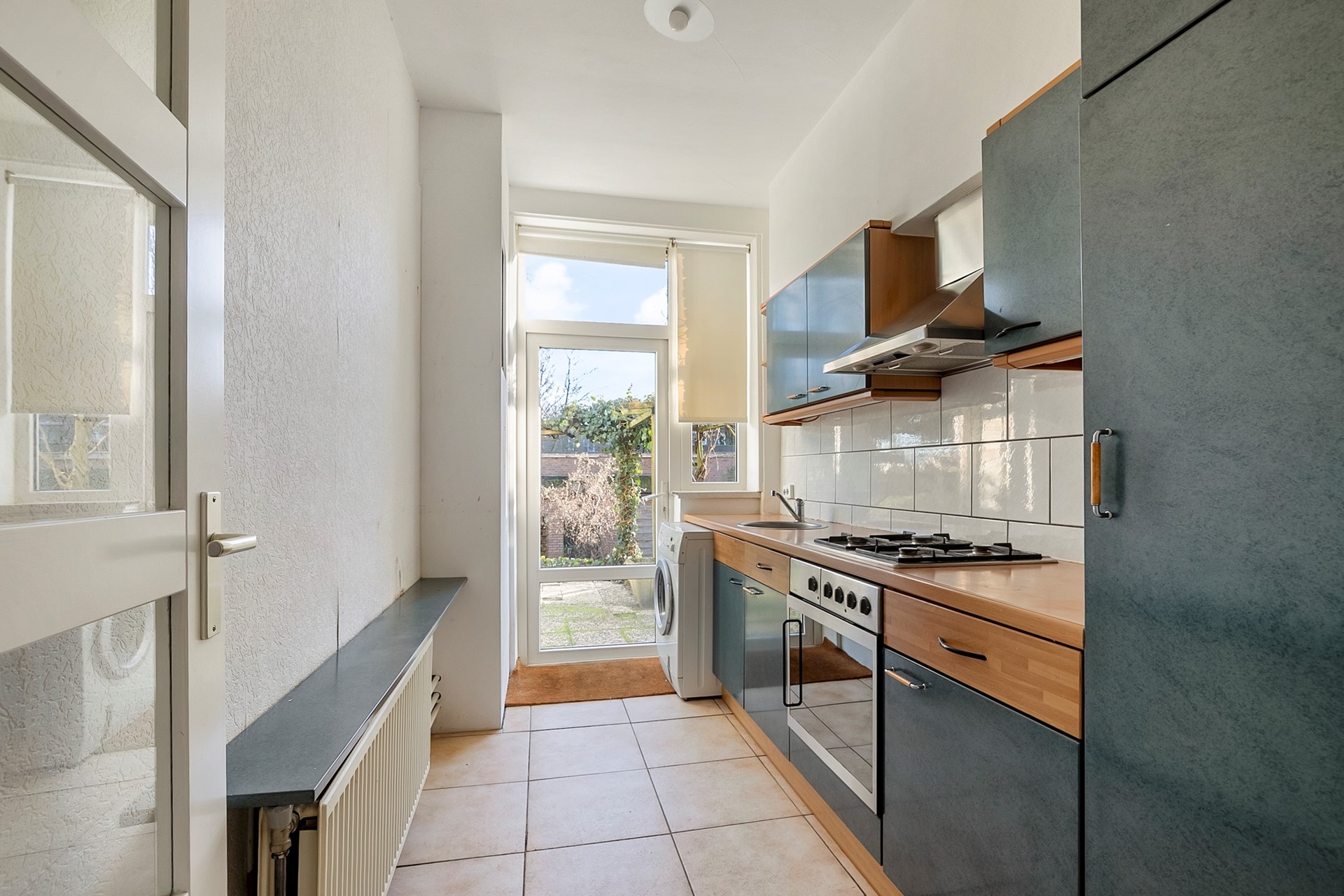 De ruime en lichte woonkamer beschikt over een karakteristieke erker aan de voorzijde en een open haard. Aan de achterzijde zorgen de schuifpui en grote raampartijen voor een fijne verbinding met de zonnige achtertuin, gelegen op het zuidoosten. De afgesloten keuken is uitgevoerd in een rechte opstelling en beschikt over een loopdeur naar de tuin. De woning telt twee slaapkamers: één slaapkamer aan de voorzijde en één slaapkamer aan de achterzijde met eveneens een loopdeur naar de tuin. De badkamer is voorzien van een douche en wastafel.
