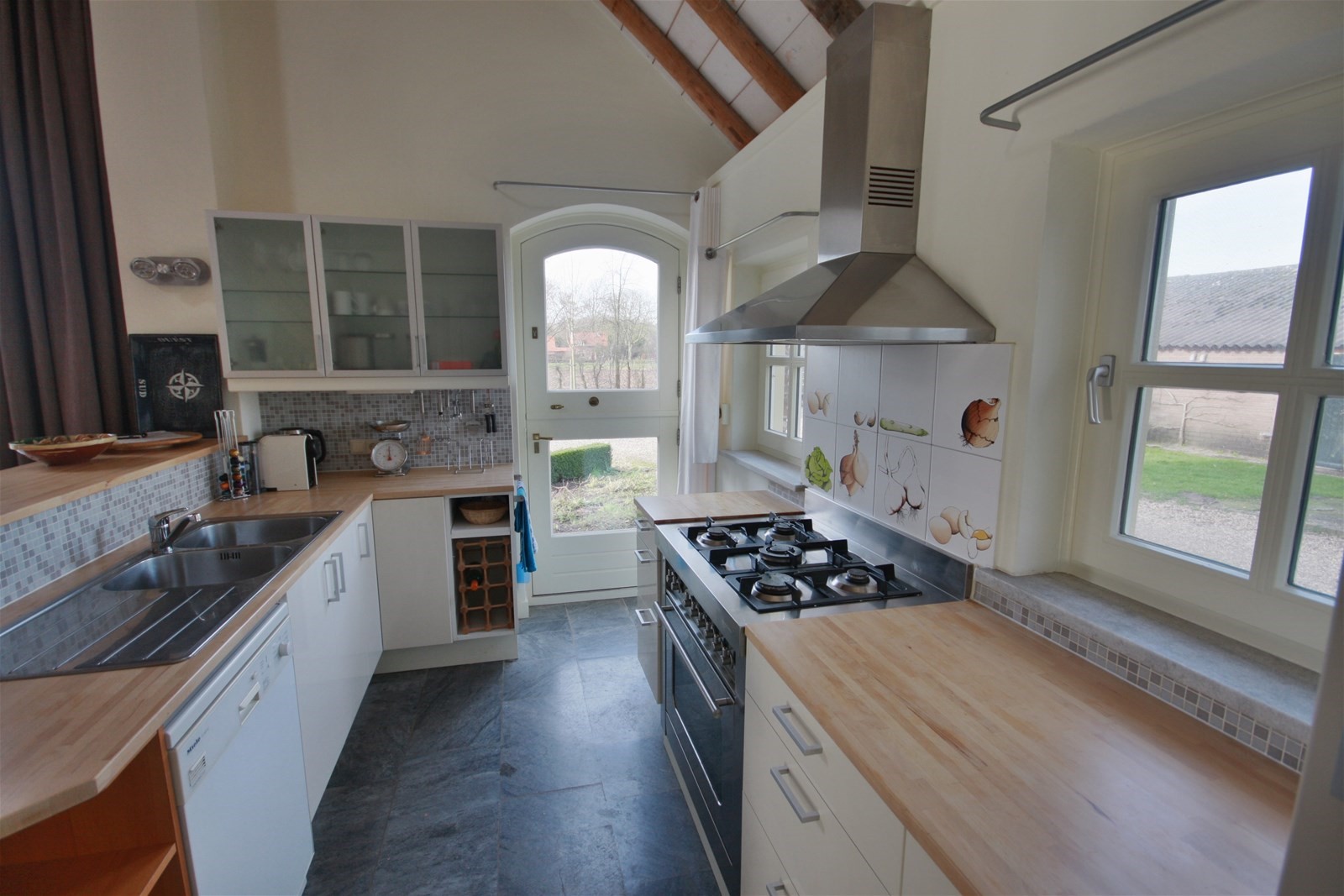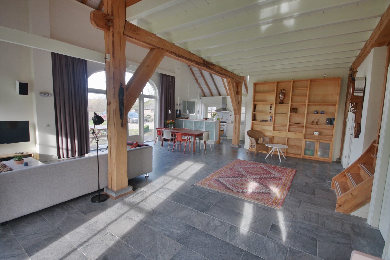Entree, ruime hal, garderobe, toilet, royale sfeervolle living met een gashaard en openslaande deuren naar het terras aan de voorzijde van de woning. De open moderne keuken is voorzien van diverse apparatuur, de bijkeuken met deur naar de keuken en naar buiten, is voorzien van een keukenblokje, spoelbak en de aansluiting voor de wasmachine en droger.