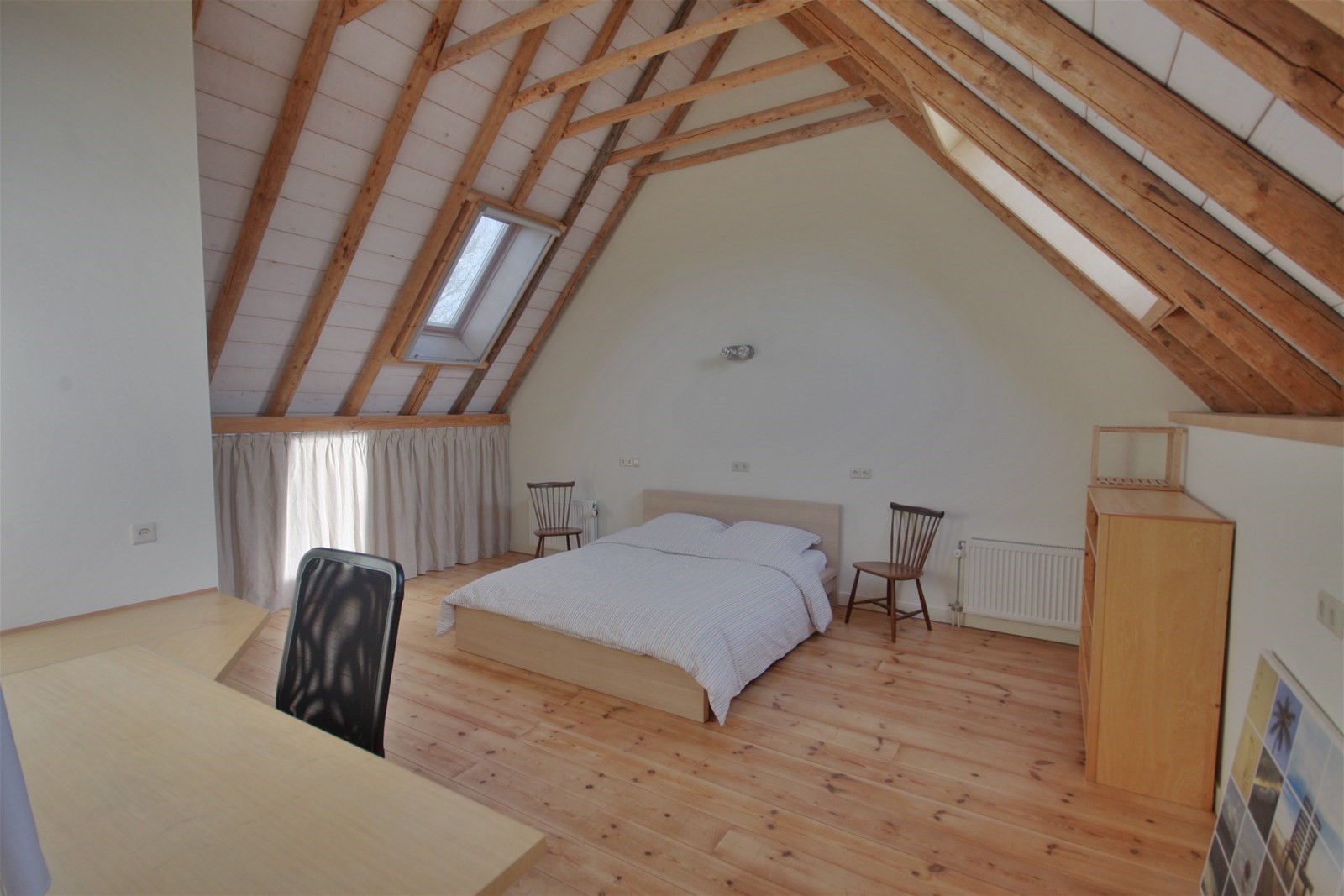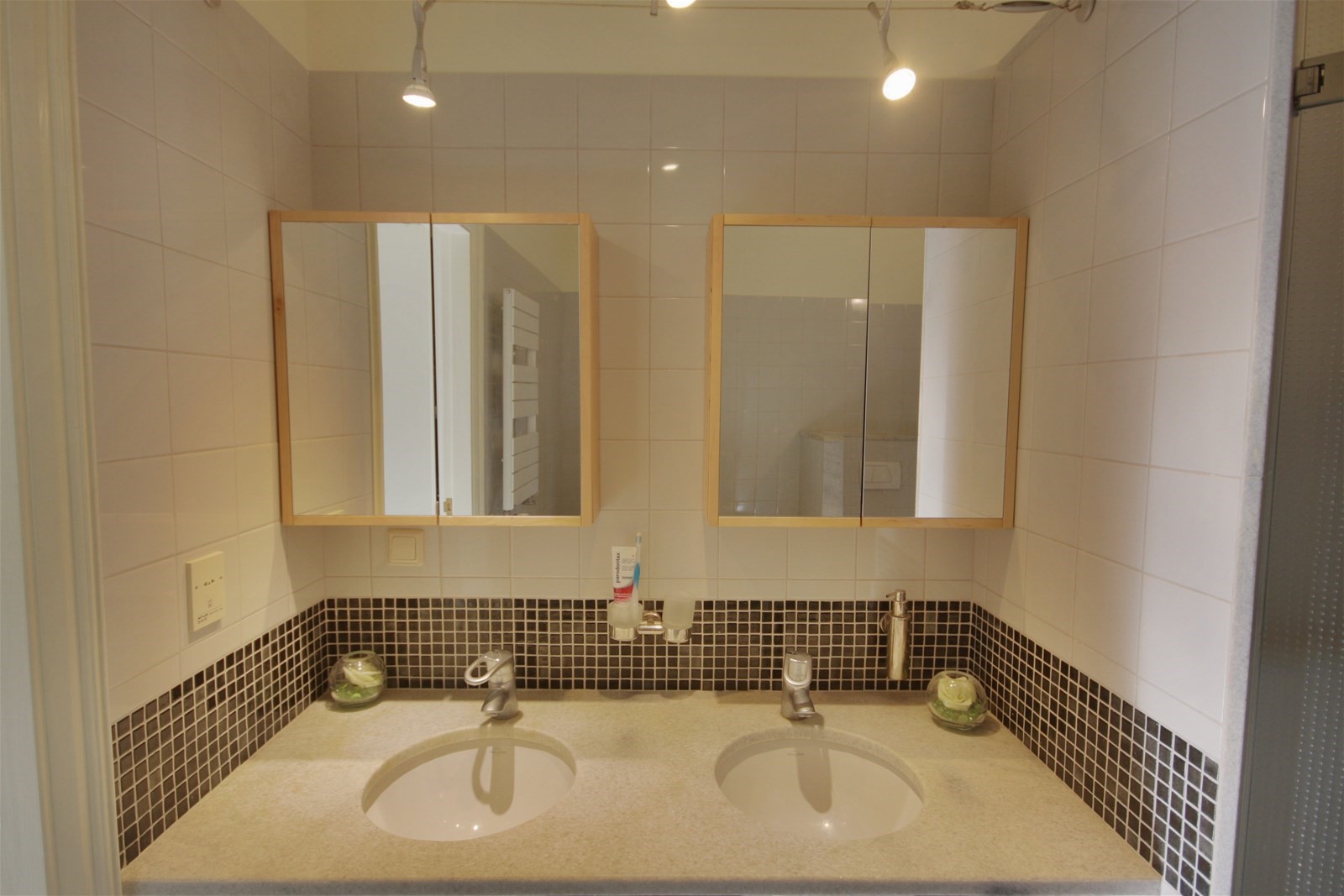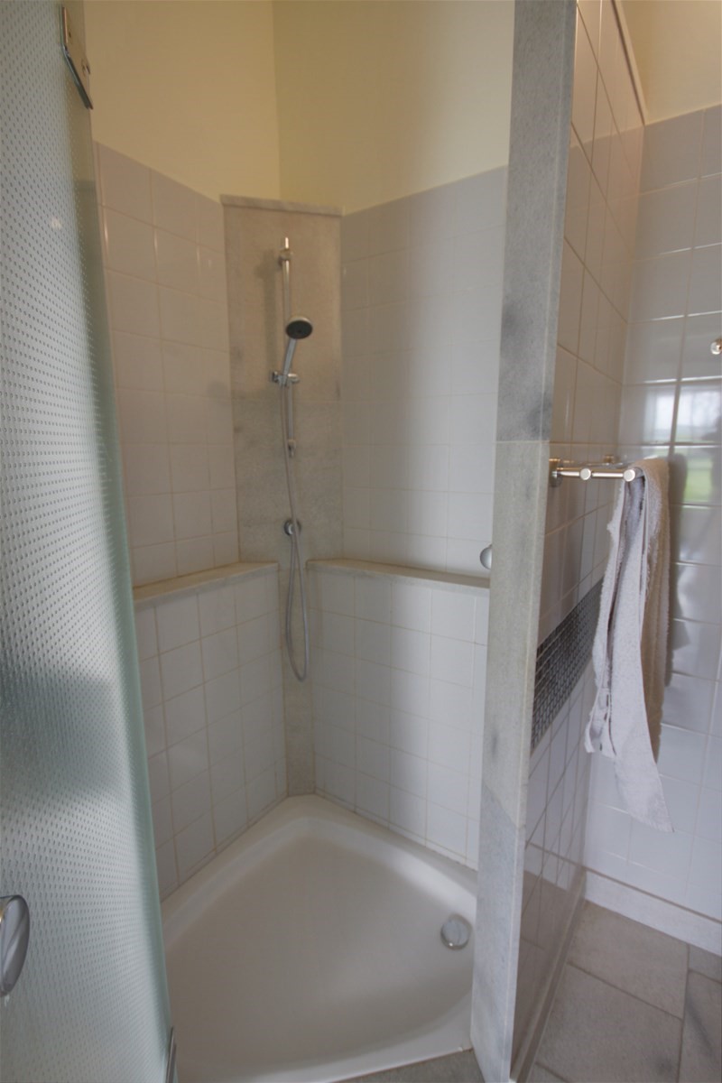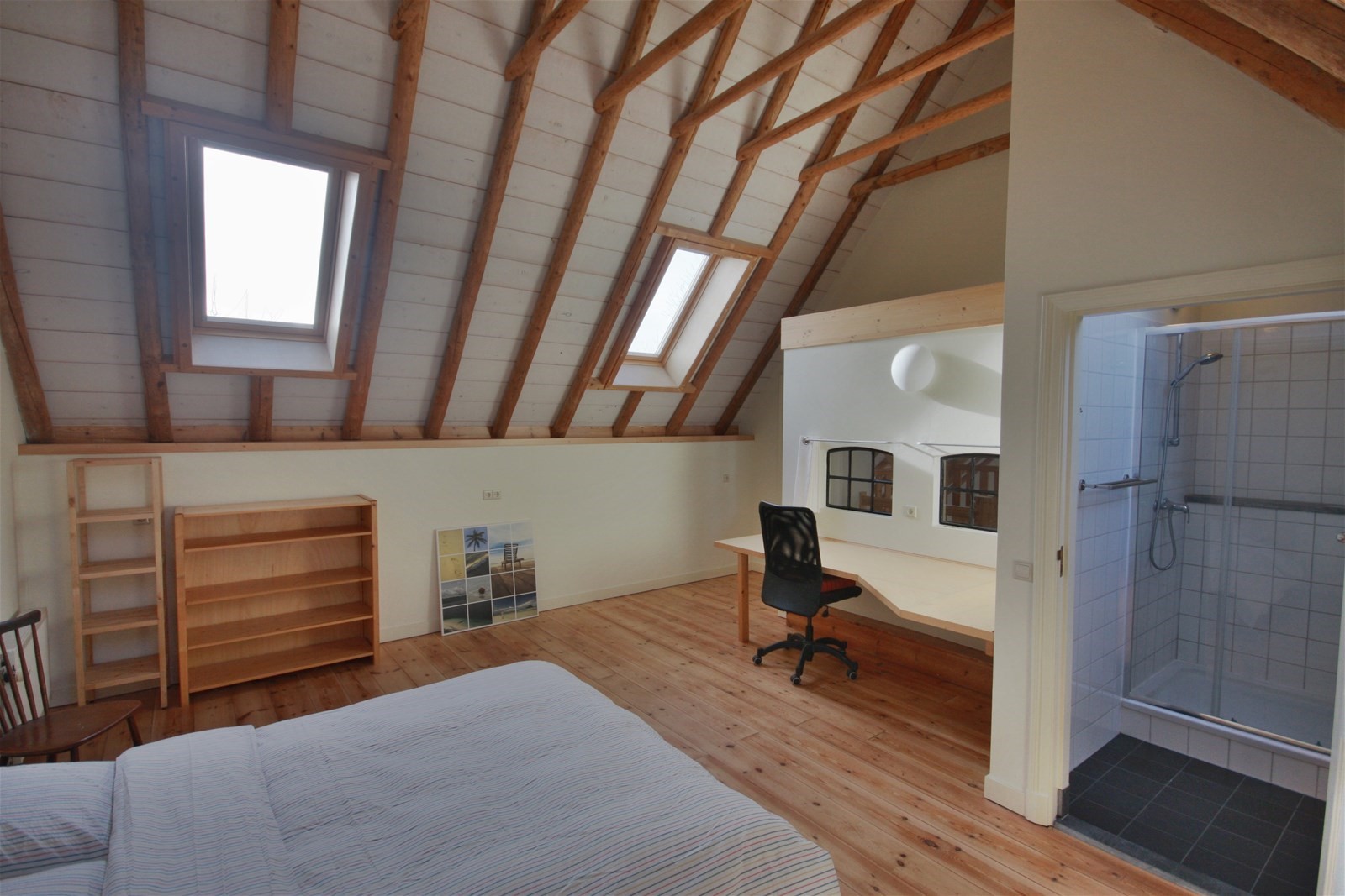 Zeer royale vide met zicht op de living, toegang tot een ruime slaapkamer met aansluitend een badkamer met douche, wastafel en toilet.
