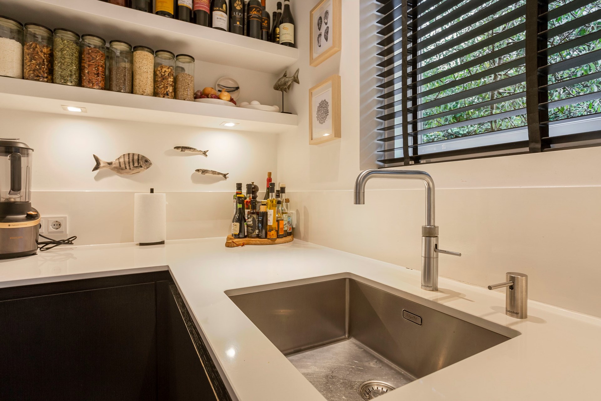 Overdekte entree, vestibule, hal, garderobe, toilet. Via de dubbele deur die toegang geeft tot de zeer sfeervolle woonkamer met een heerlijke zithoek en een prachtige visgraad vloer, een gashaard en een studeer-/werkhoek. De eetkamer is gelegen aan de achterzijde van de woonkamer, via de openslaande deuren komt u op het terras. De open moderne keuken, een kookeiland met een 5-pits gaskookplaat, diverse inbouw apparatuur en een quooker maken deze keuken tot een heerlijke plek om te koken.