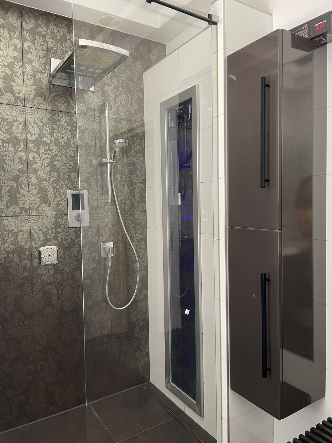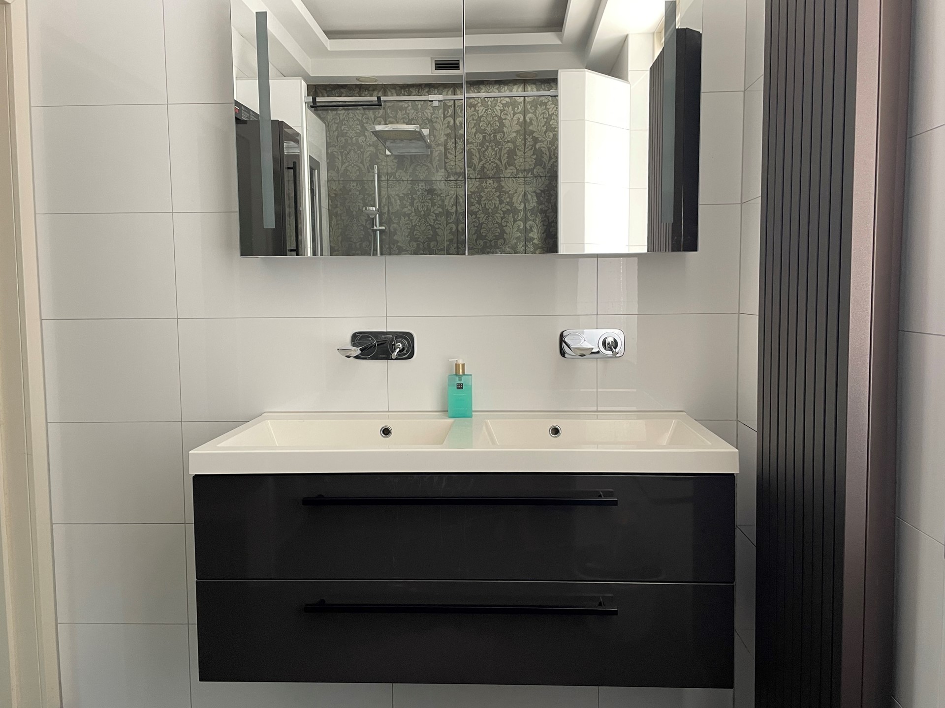 Entree, hal, moderne badkamer voorzien van luxe inloopdouche, wastafelmeubel en een toilet, evenals een praktische wasruimte.