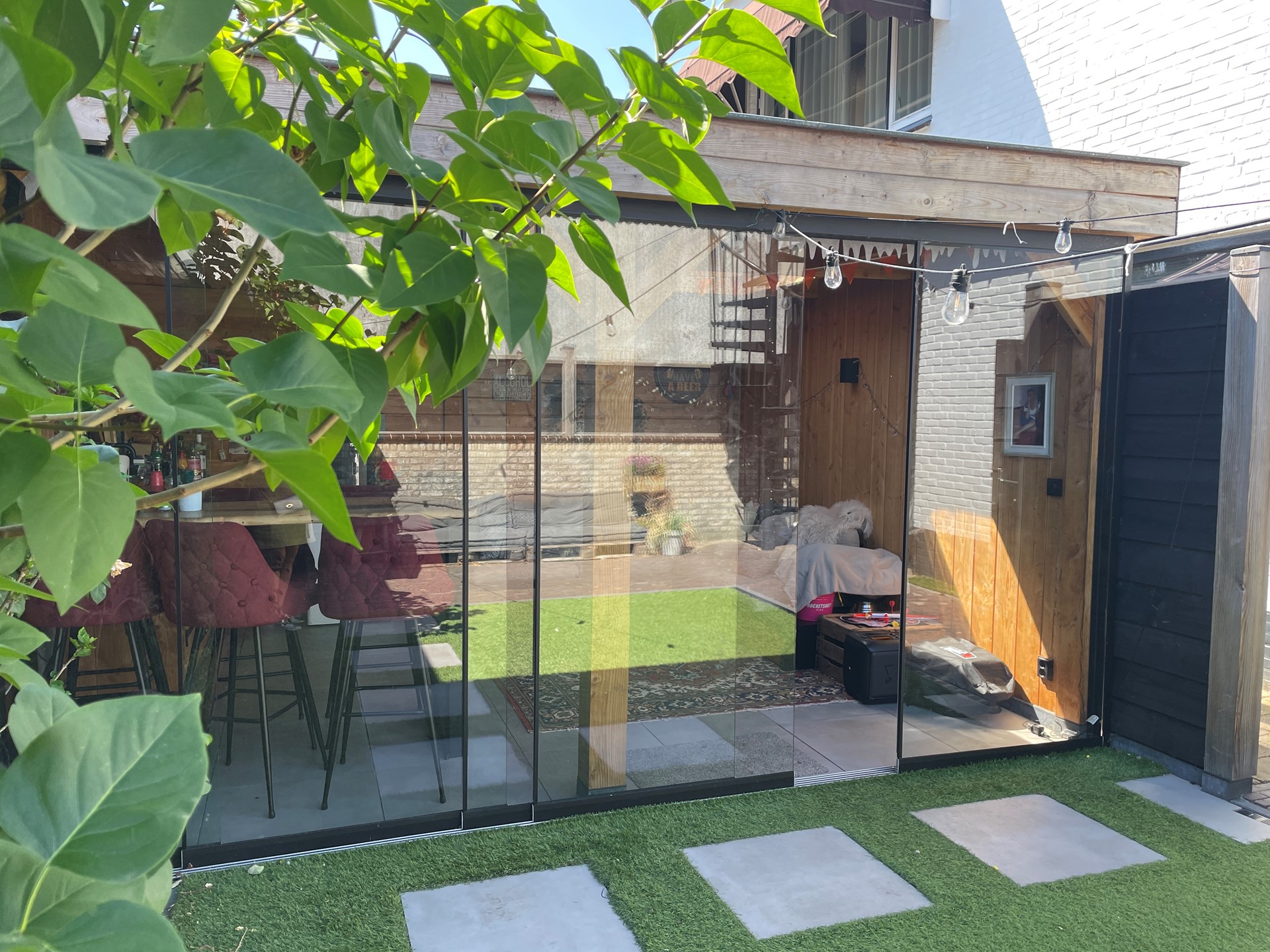 De patio is omgetoverd tot een knus buitenverblijf met een keukenblokje, waar je het hele jaar door kunt genieten of het nu gaat om een zomerbarbecue of een gezellig herfstetentje.