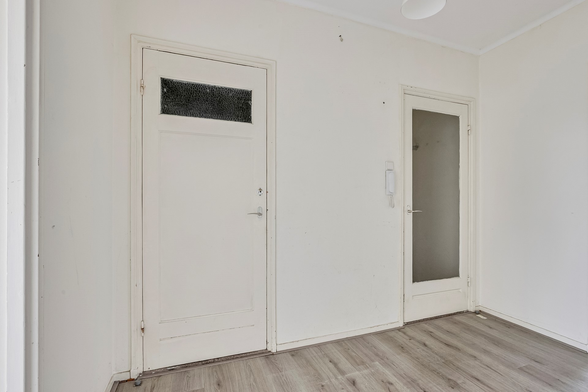 Entree van het appartement, ruime hal. De lichte en sfeervolle woonkamer biedt een prettige leefruimte. De halfopen keuken is middels een schuifdeur af te sluiten van de woonkamer en geeft toegang tot het balkon. De keuken is voorzien van een oven, vaatwasser, gaskookplaat en afzuiginstallatie.