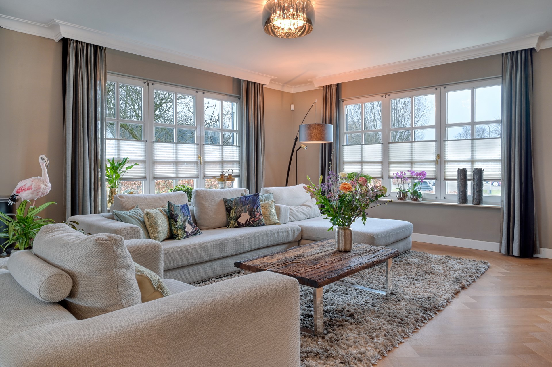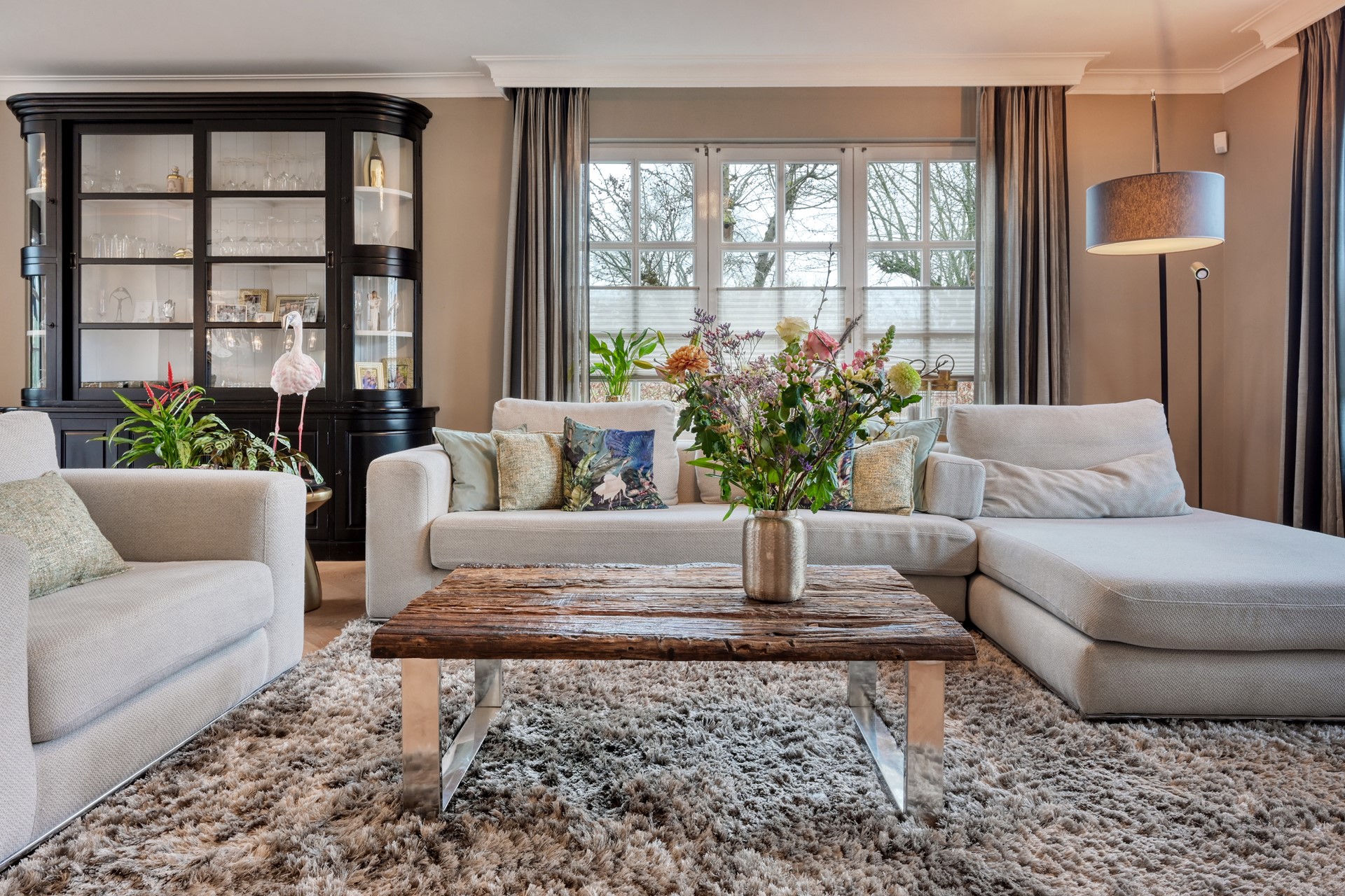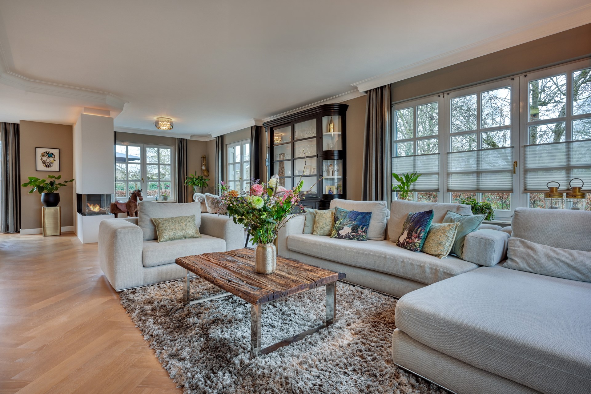 Bij binnenkomst ervaart u direct de ruimte en sfeer. De royale hal met garderobe en modern toilet met fontein vormt een stijlvolle entree naar de L-vormige woonkamer. Deze sfeervolle leefruimte is hoogwaardig afgewerkt met een traditioneel gelegd parket in visgraatmotief, traditioneel gestukadoorde plafondlijsten, subtiele inbouwverlichting en een gashaard die warmte en ambiance toevoegt. Openslaande deuren verbinden binnen en buiten op natuurlijke wijze en bieden een prachtig uitzicht over het terras en de tuin. De gehele begane grond is voorzien van comfortabele vloerverwarming.