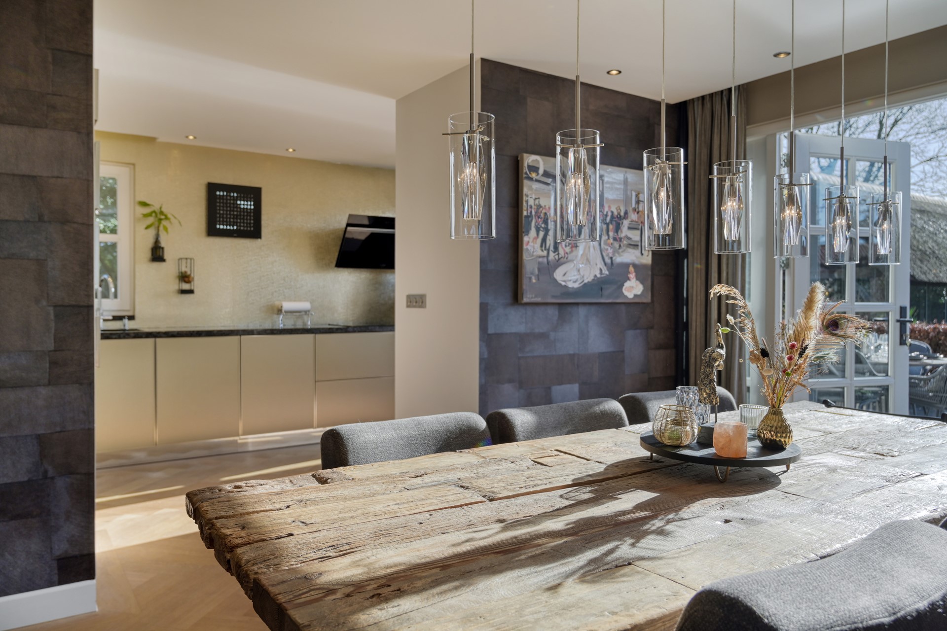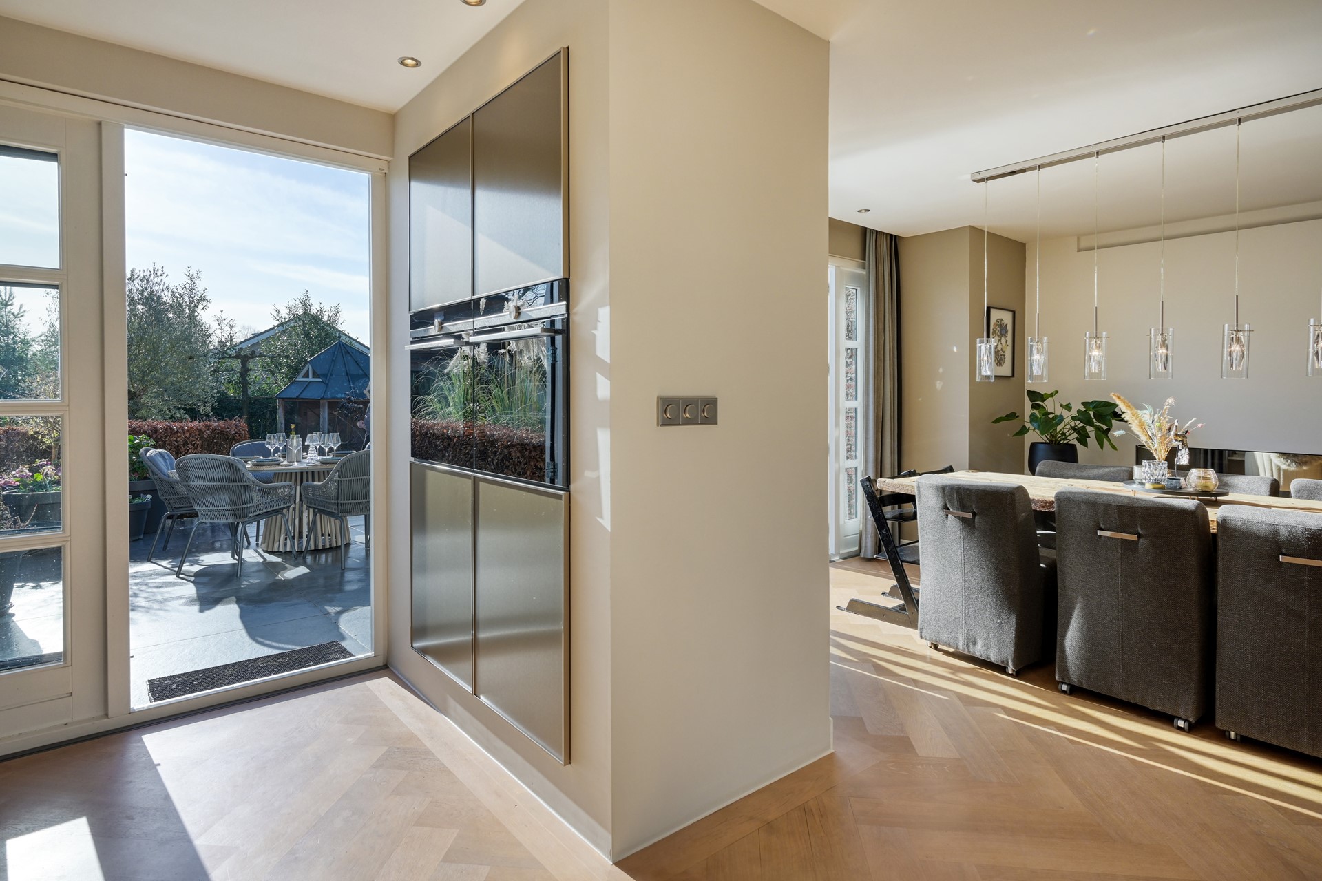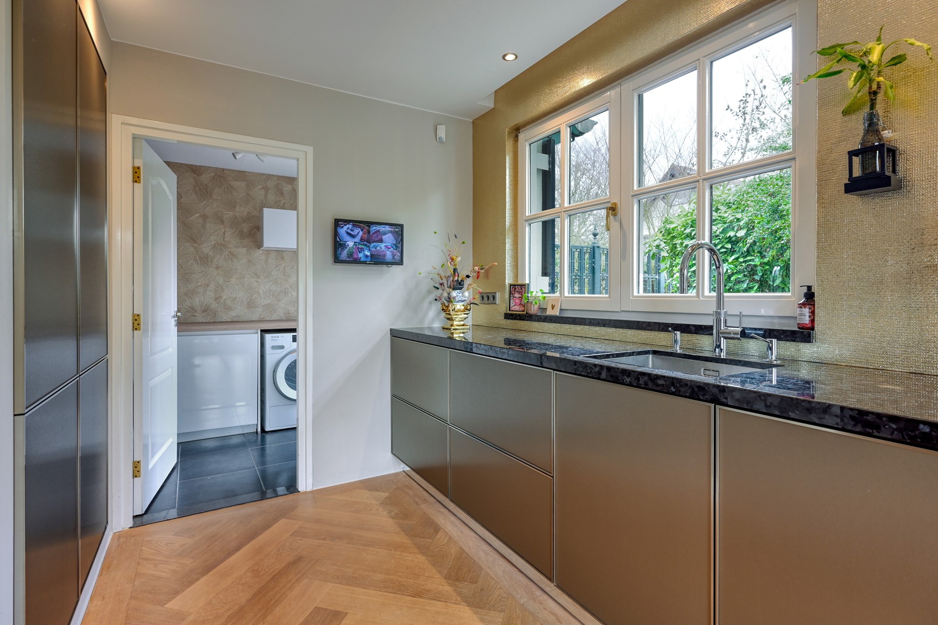 De open Siematic keuken (2020) vormt een harmonieus geheel met de living en is uitgevoerd met een natuurstenen werkblad en hoogwaardige Siemens inbouwapparatuur, waaronder een inductiekookplaat, afzuigkap, vaatwasser, Quooker, stoomoven, combimagnetron/-oven, koelkast en vriezer. Een keuken die zowel functioneel als esthetisch overtuigt.