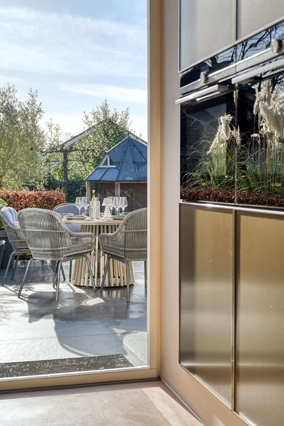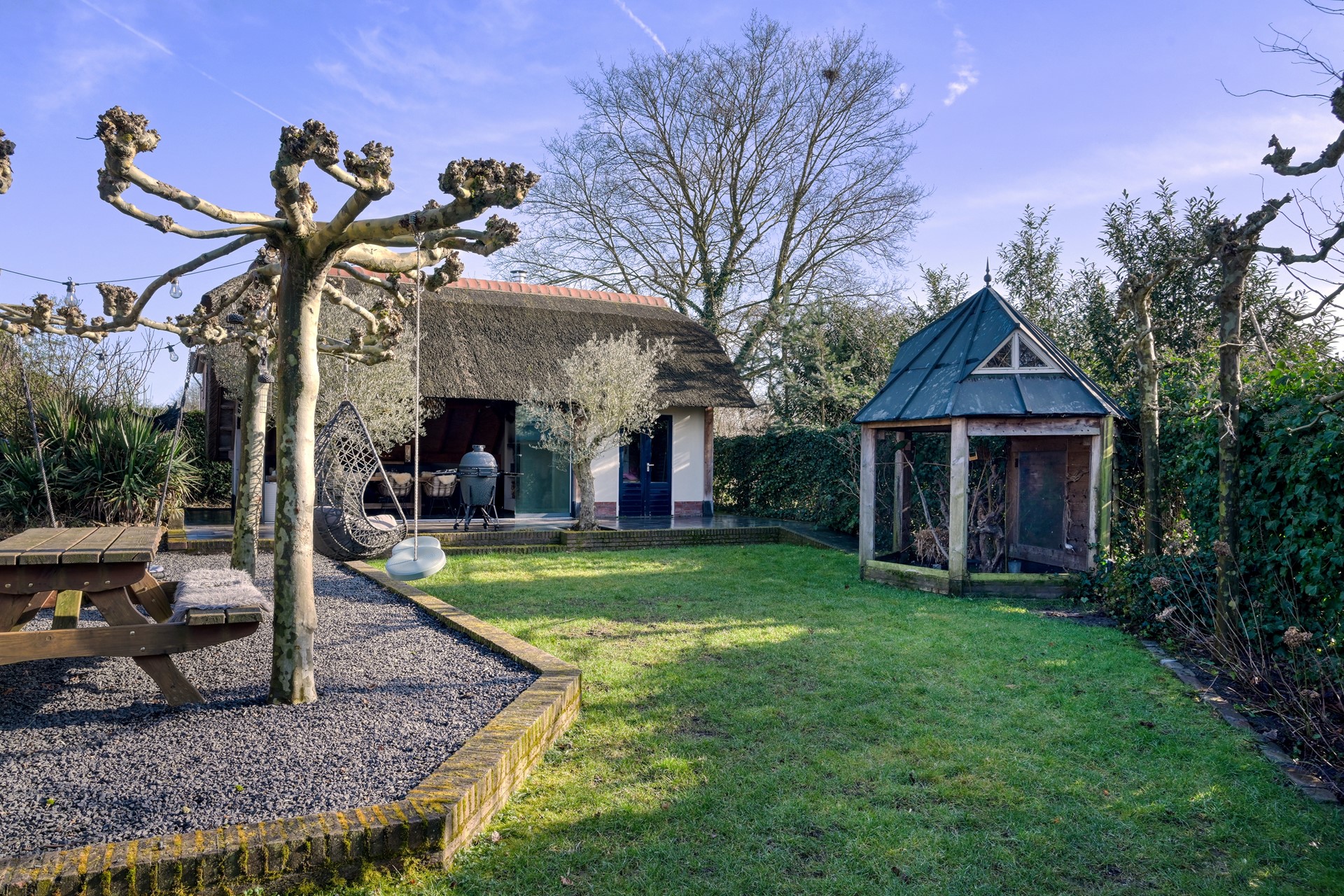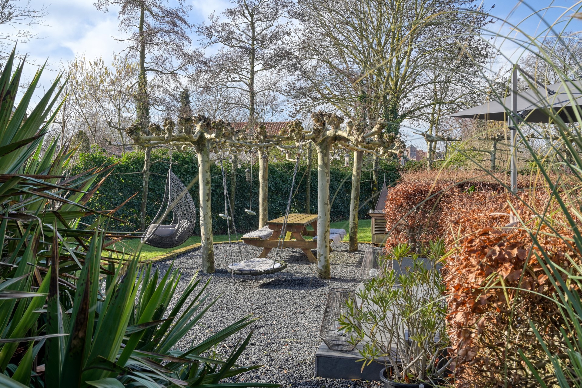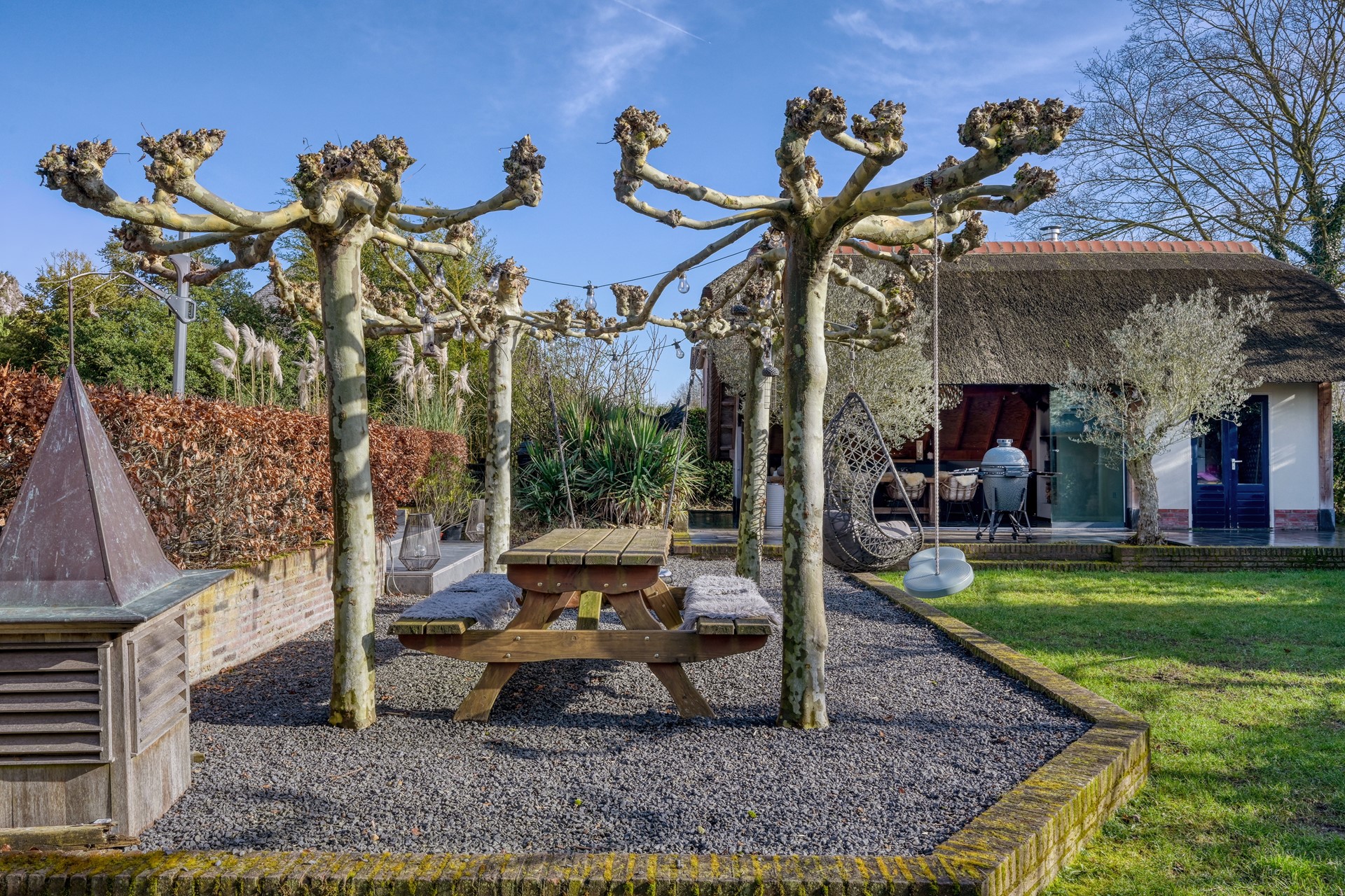 Centraal in de tuin bevindt zich een sfeervolle pergola van dakplatanen, die in het groeiseizoen een natuurlijk groen dak vormt. Hier is ruimte gecreëerd voor ontspanning en samenzijn: een picknicktafel voor lange diners in de schaduw, een hangstoel en speelse zitplekken die de tuin een informele en gastvrije sfeer geven.