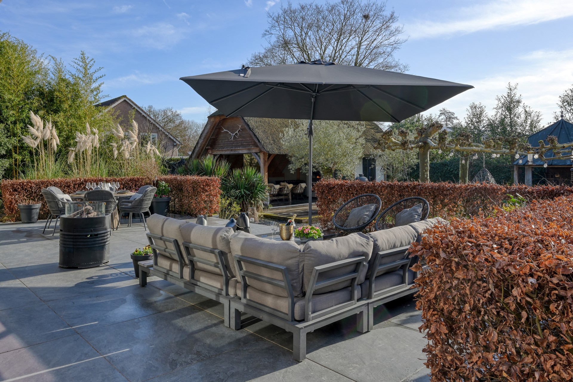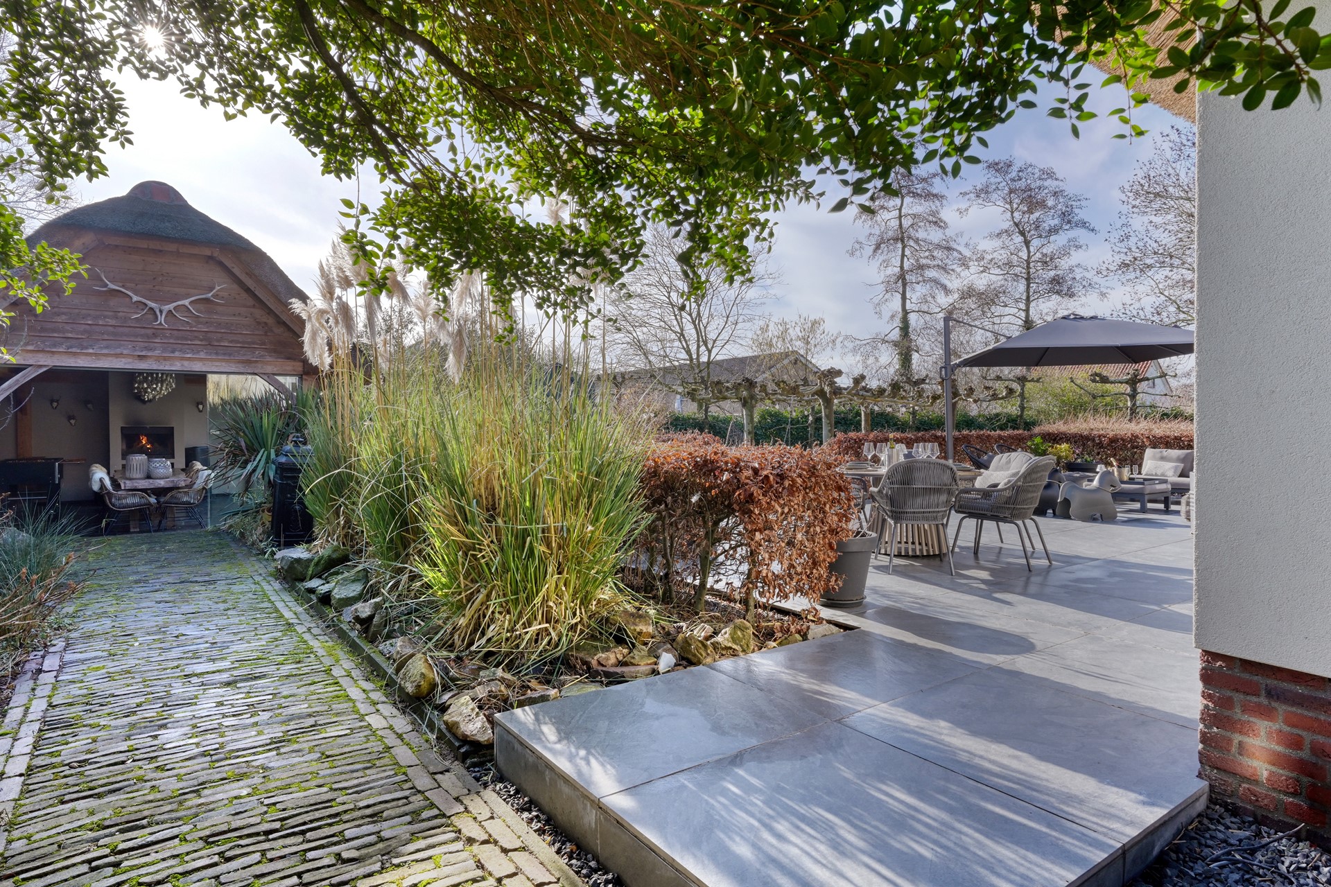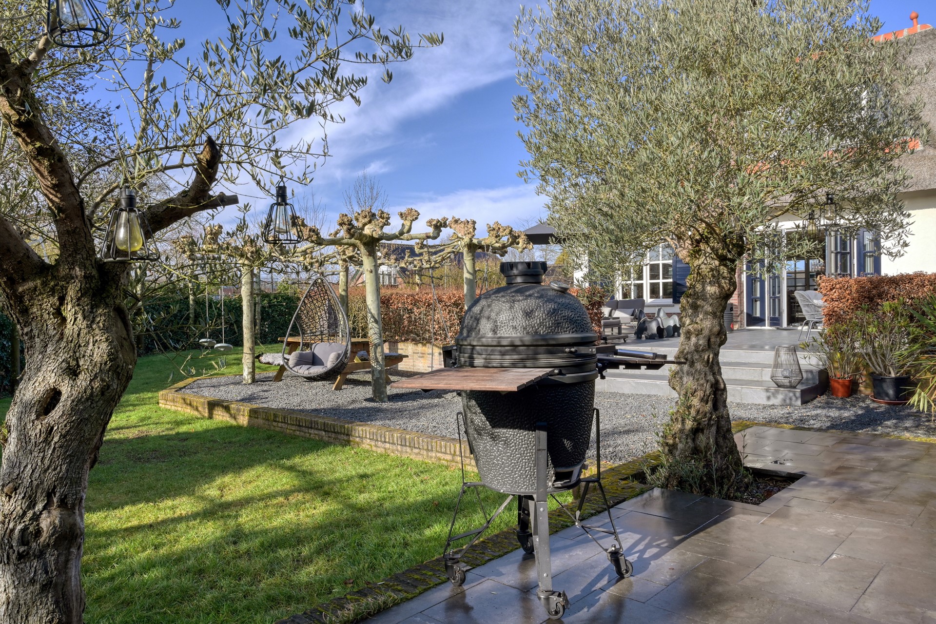 De tuin rondom de woning ademt rust, privacy en een uitgesproken gevoel van luxe buitenleven. Direct aan de woning bevindt zich een royaal terras, waar een comfortabele loungehoek onder de parasol uitnodigt tot lange zomerse avonden.