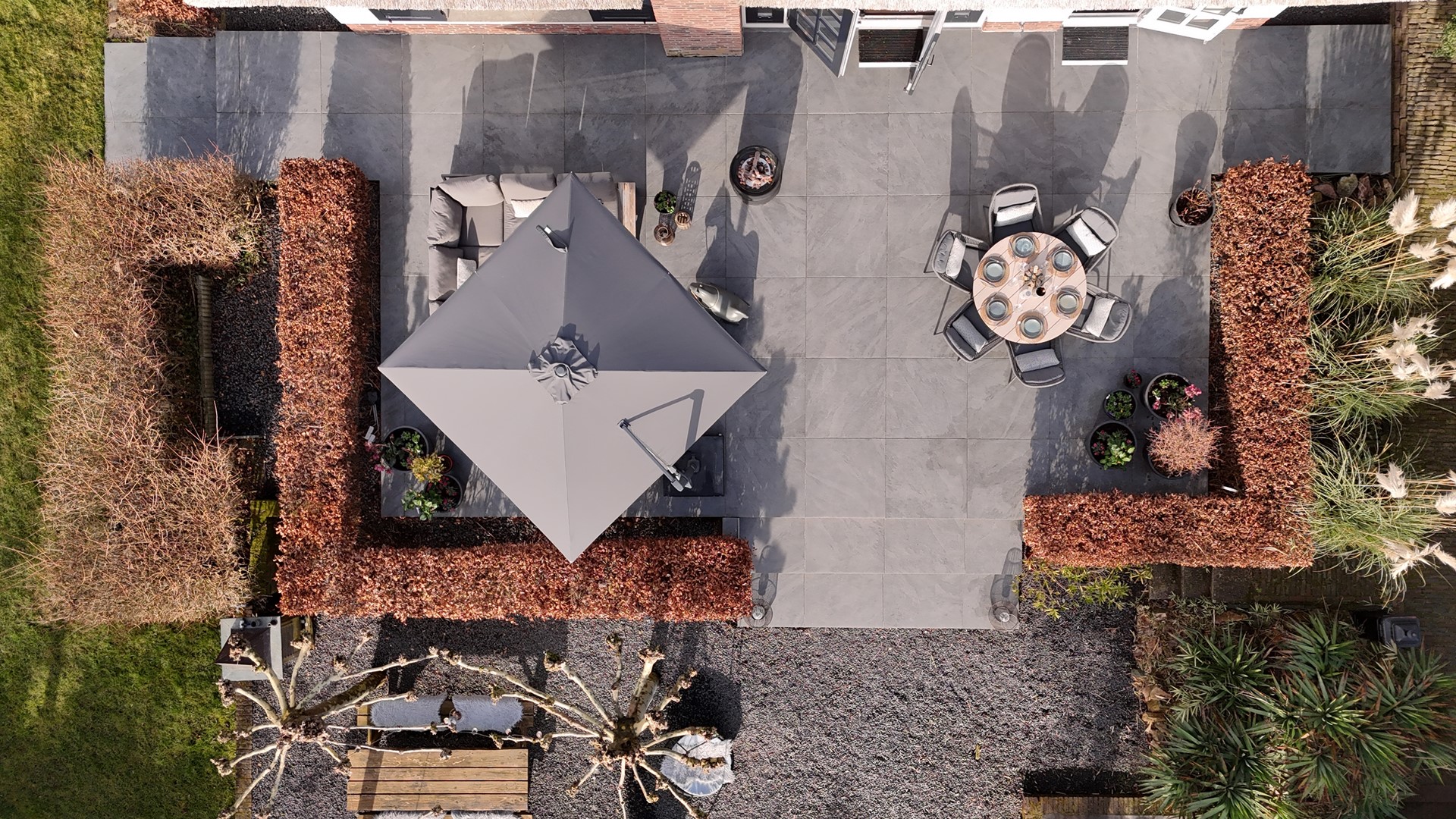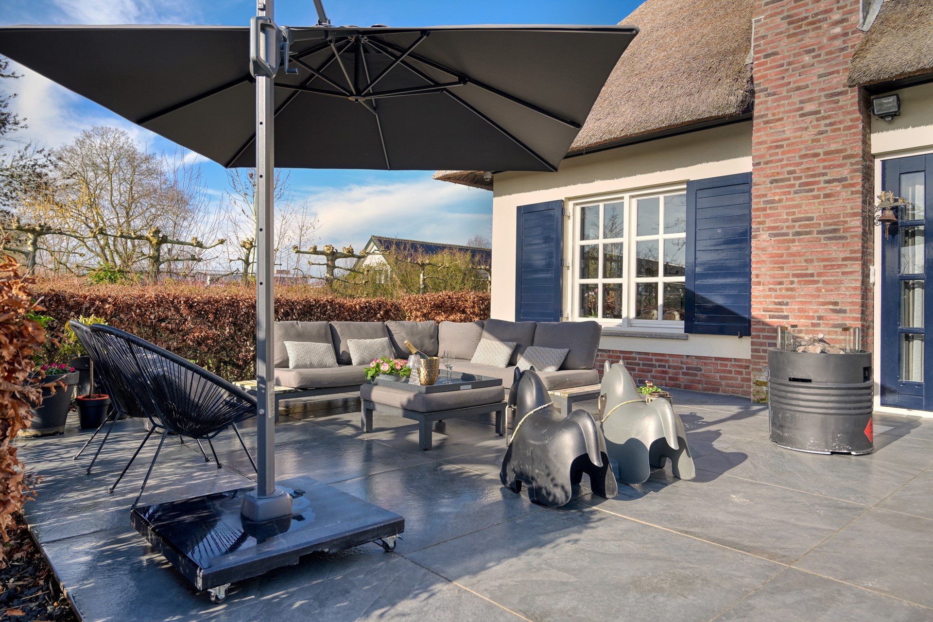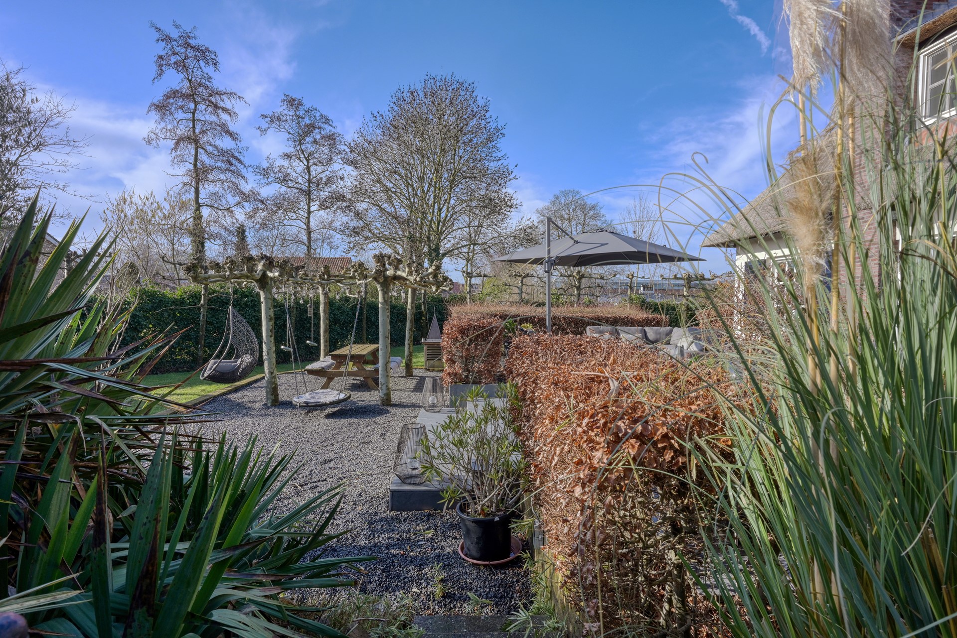 De tuin rondom de woning ademt rust, privacy en een uitgesproken gevoel van luxe buitenleven. Direct aan de woning bevindt zich een royaal terras, waar een comfortabele loungehoek onder de parasol uitnodigt tot lange zomerse avonden.
