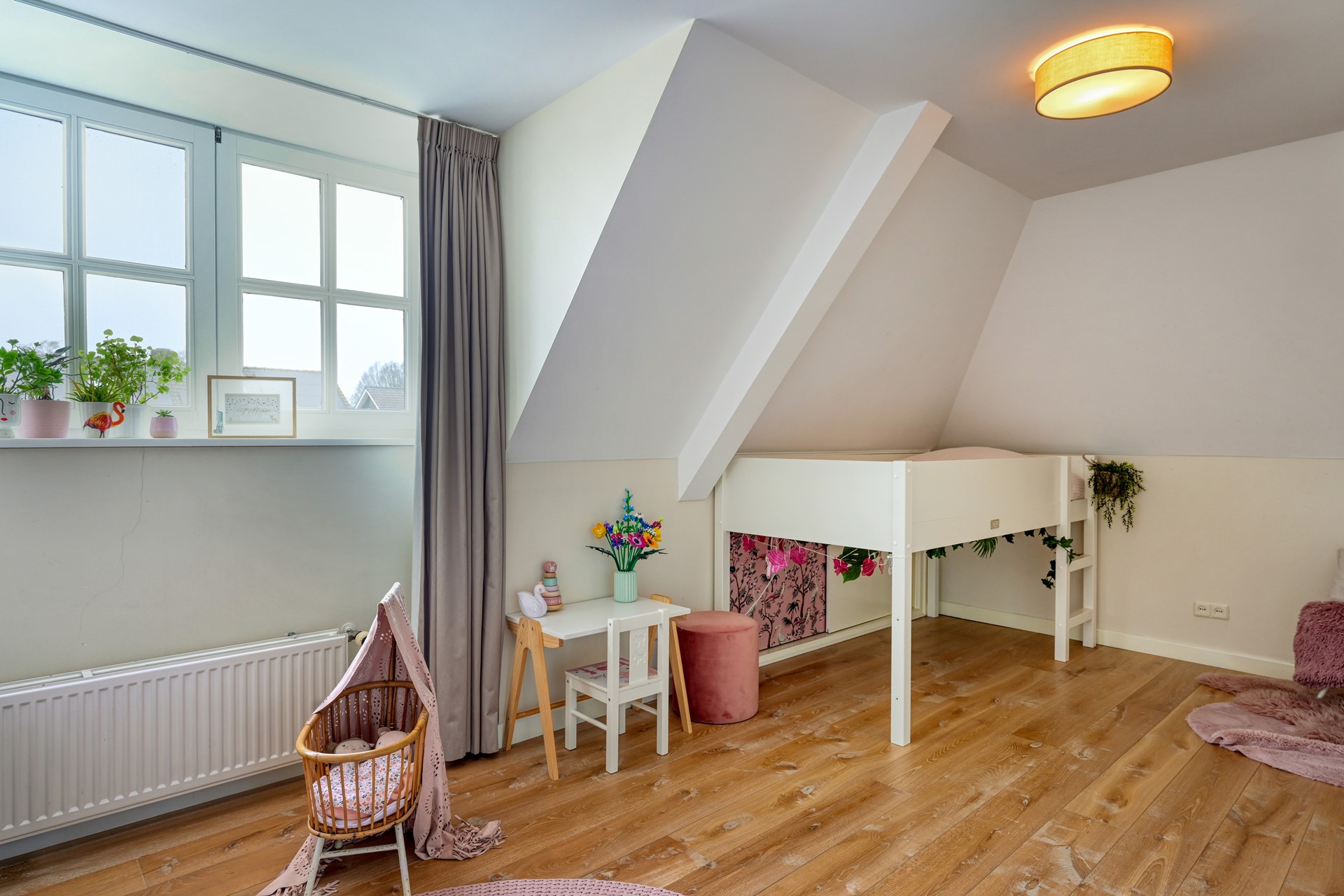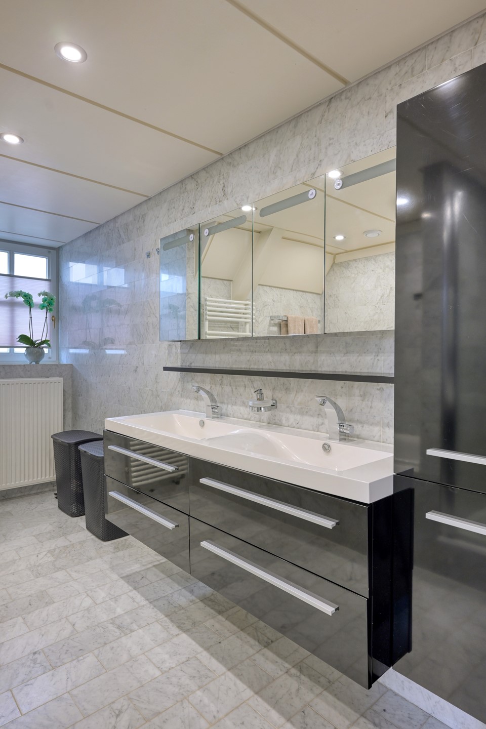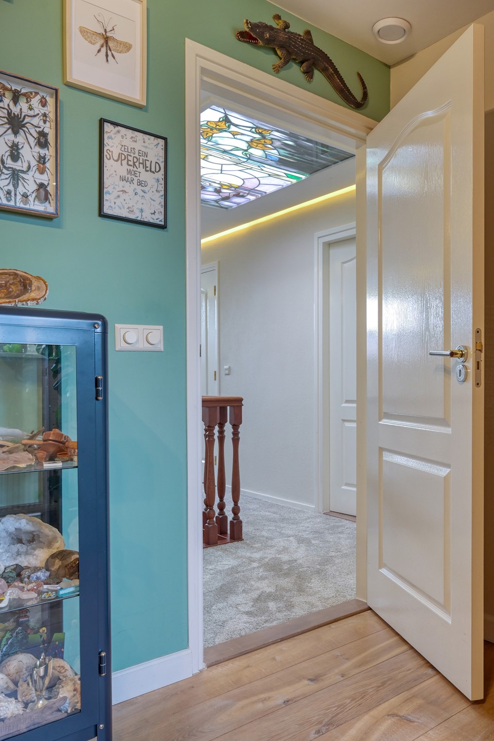 De lichte overloop, verrijkt met een glas-in-lood detail in het plafond, zorgt voor een aangename natuurlijke lichtinval. Hier bevinden zich drie royale slaapkamers, allen voorzien van houten vloeren en vaste kasten. De verdieping is voorzien van een separaat toilet met fontein, een luxe badkamer en praktische bergruimte. Deze badkamer beschikt over een ligbad, een douchecabine, een wastafelmeubel met dubbele wastafel, een designradiator en vloerverwarming. Een comfortabele en complete verdieping waar rust en functionaliteit samenkomen.