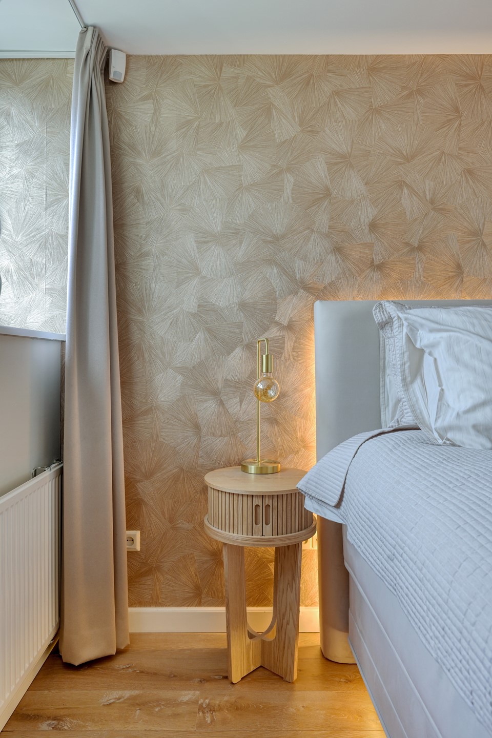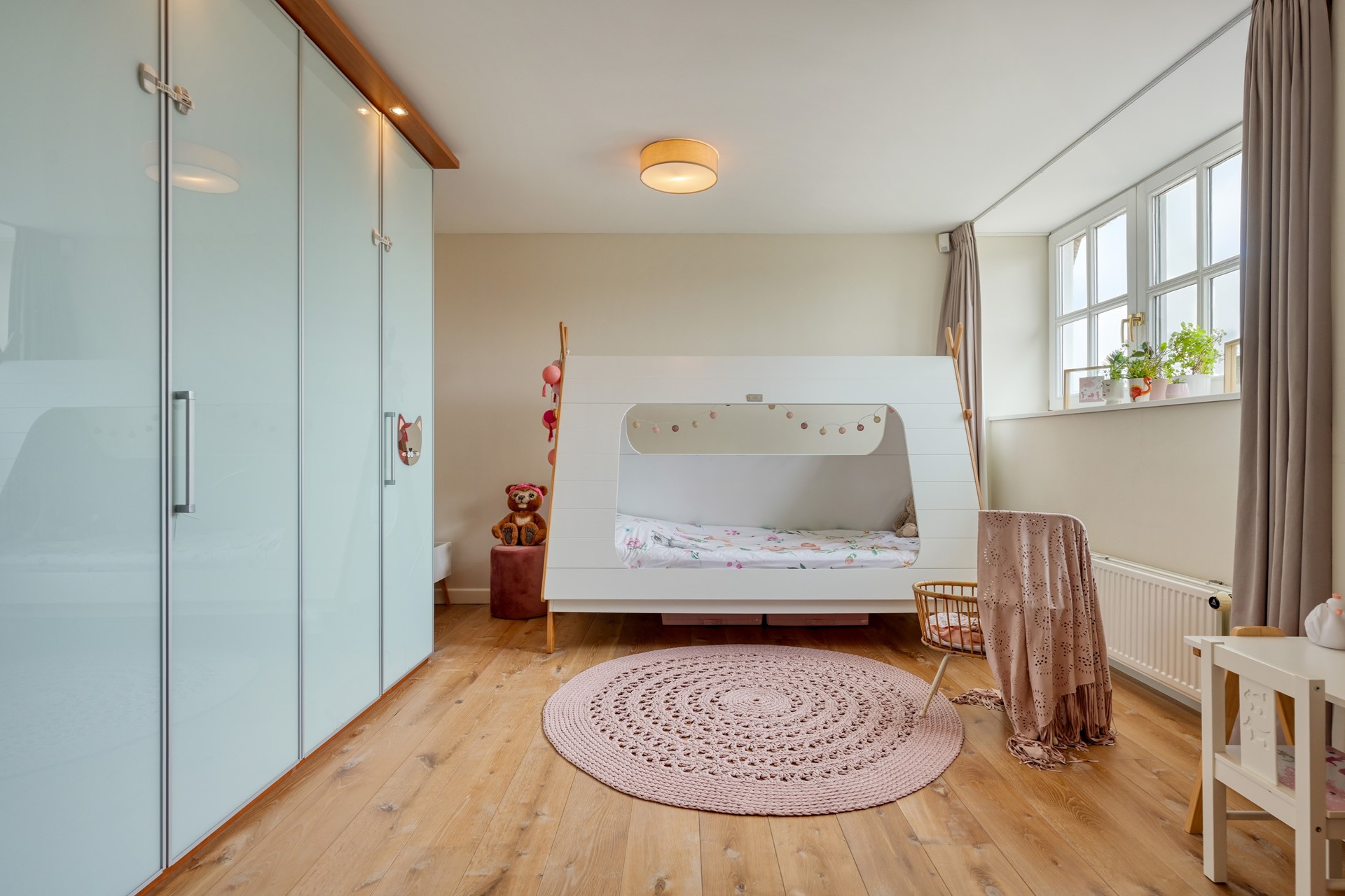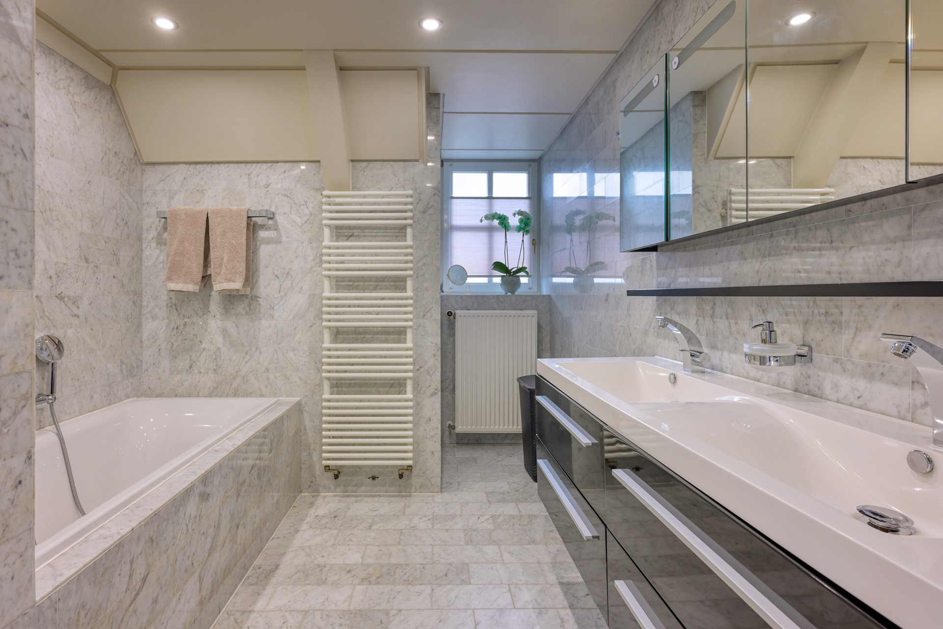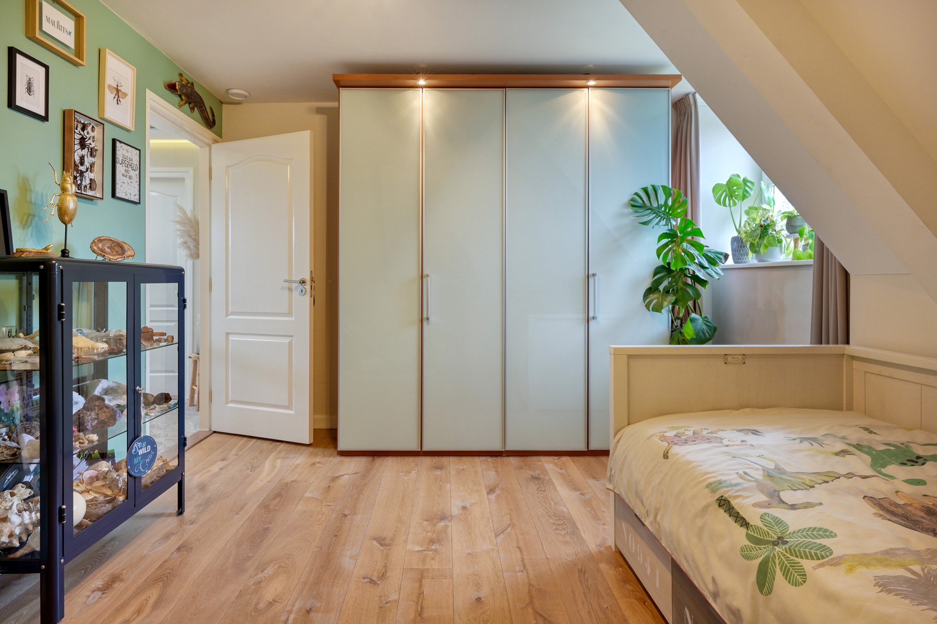 De lichte overloop, verrijkt met een glas-in-lood detail in het plafond, zorgt voor een aangename natuurlijke lichtinval. Hier bevinden zich drie royale slaapkamers, allen voorzien van houten vloeren en vaste kasten. De verdieping is voorzien van een separaat toilet met fontein, een luxe badkamer en praktische bergruimte. Deze badkamer beschikt over een ligbad, een douchecabine, een wastafelmeubel met dubbele wastafel, een designradiator en vloerverwarming. Een comfortabele en complete verdieping waar rust en functionaliteit samenkomen.