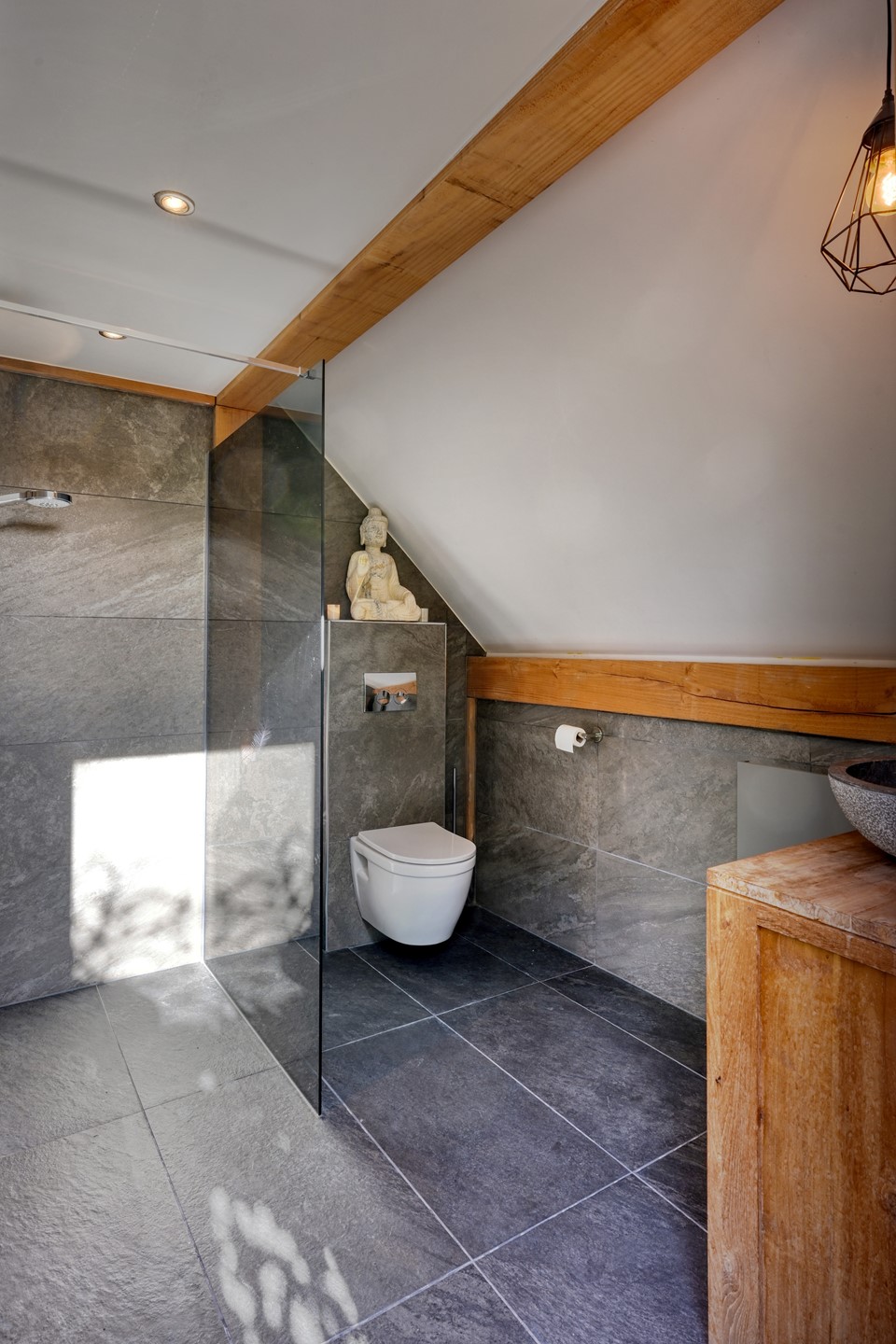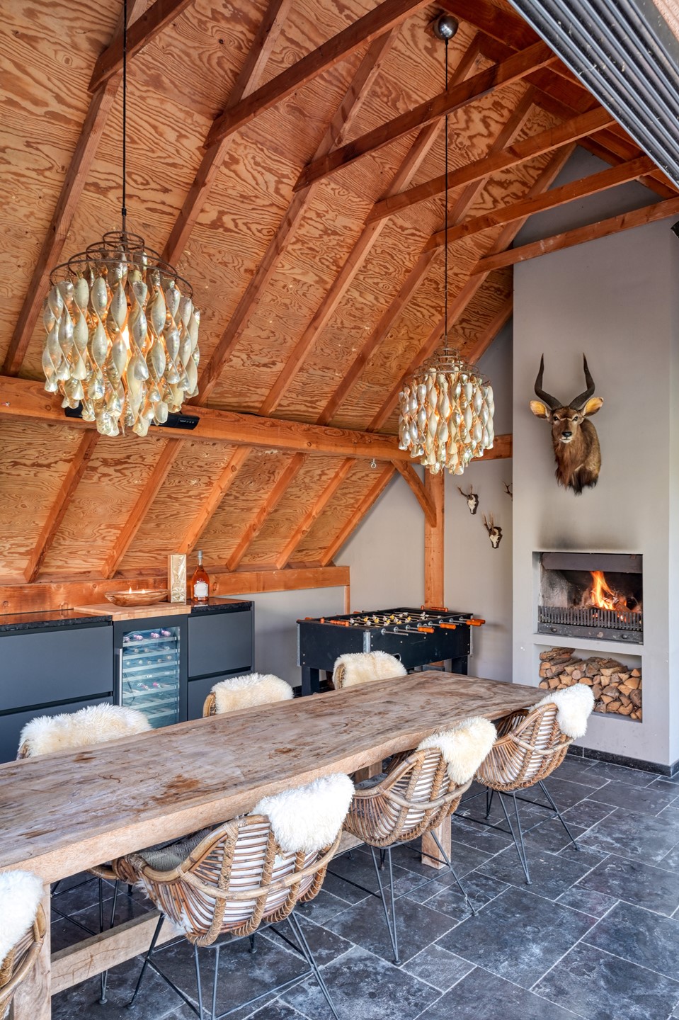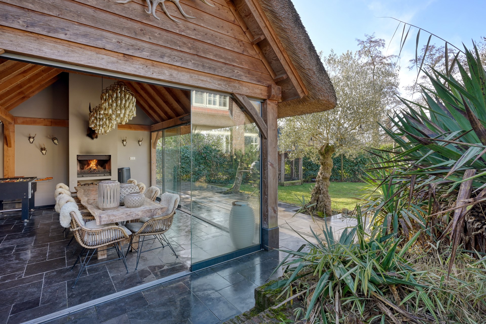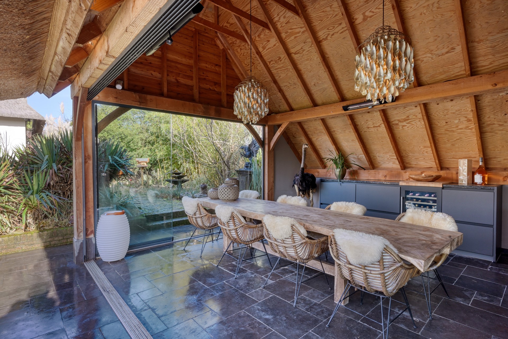 Een bijzonder element is het rietgedekte bijgebouw, ingericht als volwaardige tuinkamer. De warme houtconstructie, de grote glazen puien en de sfeervolle houtkachel maken dit tot een plek waar binnen en buiten naadloos in elkaar overlopen. De ruimte is voorzien van een keukenopstelling en een wijnklimaatkast, met aansluitend een eigen sanitaire ruimte met toilet, wastafel en douche. Daarnaast beschikt het bijgebouw over een berging met een praktische bergzolder, ideaal voor extra opslag.