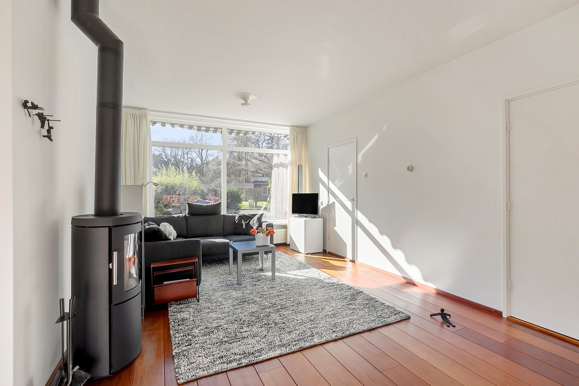 De lichte woonkamer vormt het hart van de woning en is afgewerkt met een fraaie houten vloer en een sfeervolle houtkachel. Grote raampartijen zorgen voor een aangename lichtinval en een open uitstraling. De eethoek staat in directe verbinding met de tuin; via openslaande deuren bereikt u het terras en de zonnige tuin op het zuidwesten. Hier geniet u tot in de avonduren van rust en privacy.