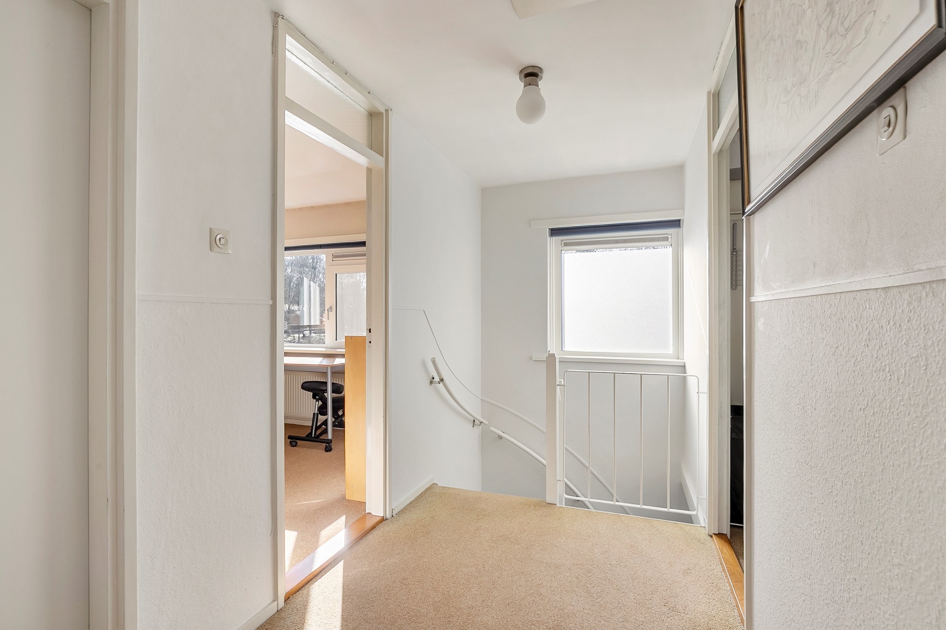 De overloop geeft toegang tot drie slaapkamers en een werkkamer, ideaal voor een gezin of voor wie behoefte heeft aan een extra werk- of hobbykamer. De badkamer is volledig betegeld en uitgerust met een douche, hangtoilet en wastafel. De gehele bovenverdieping is voorzien van kunststof kozijnen met HR++ beglazing, wat bijdraagt aan comfort en energiezuinigheid.