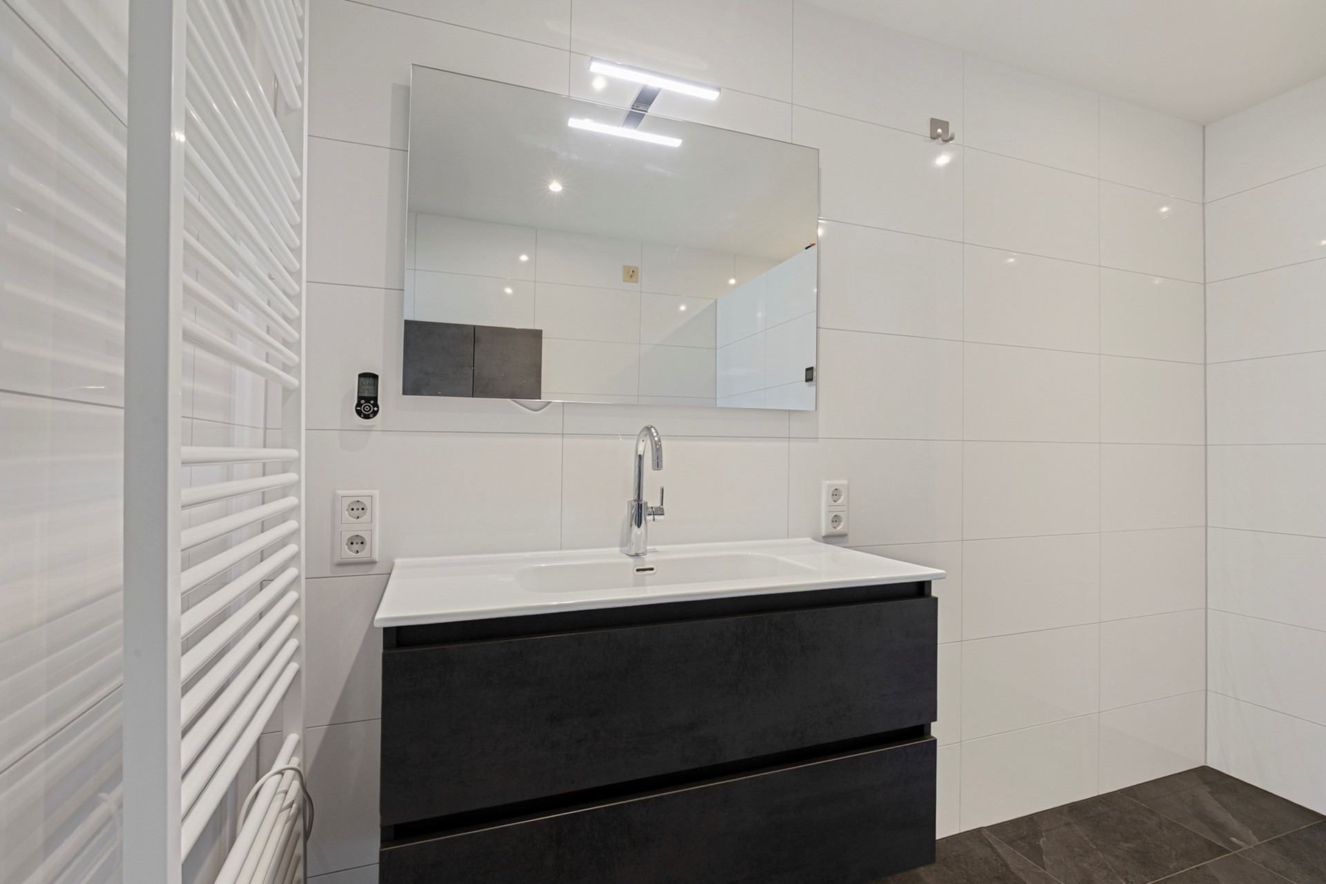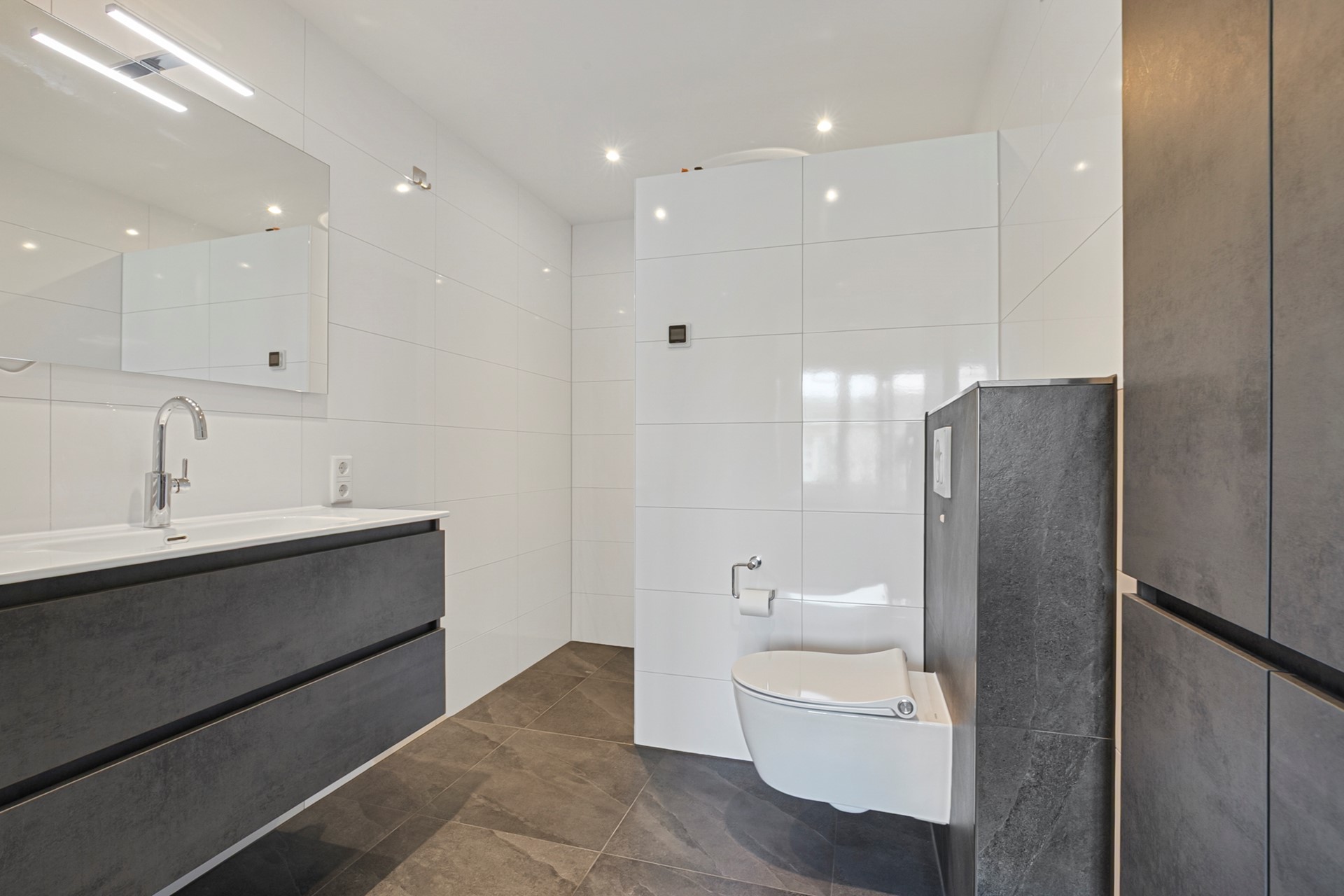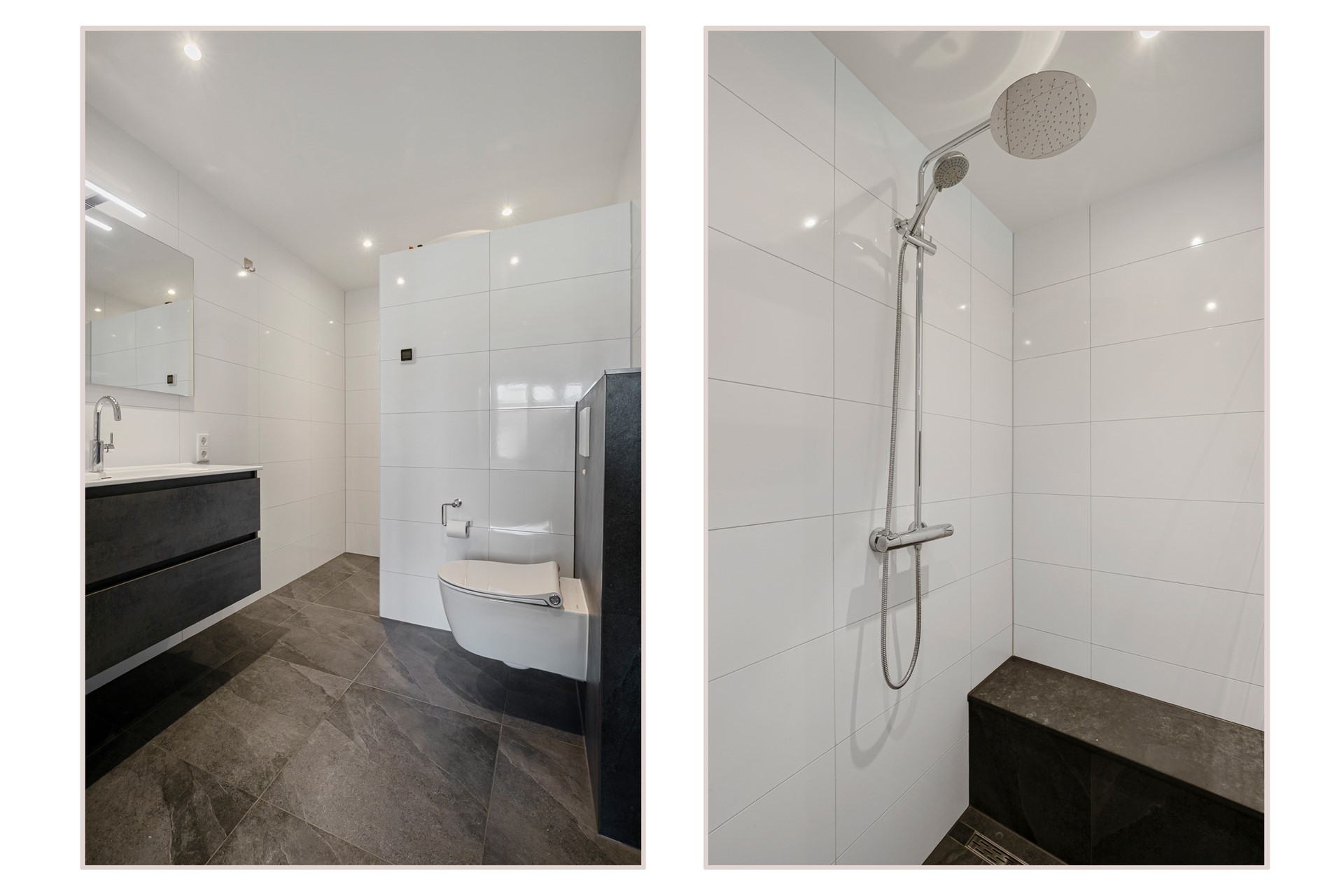 Het appartement beschikt over twee slaapkamers. De moderne badkamer is bereikbaar via de hoofdslaapkamer en is uitgerust met een ruime inloopdouche, een wastafelmeubel, een verlichte spiegel, een handdoekenkast en een tweede toilet.