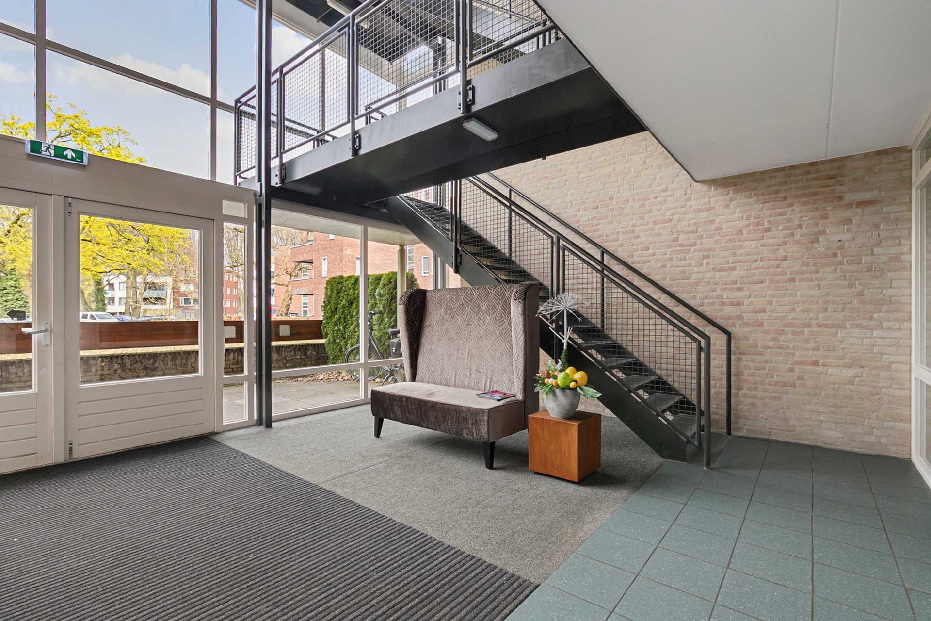 Afgesloten entree met videofooninstallatie, trappenhuis en liftinstallatie.
